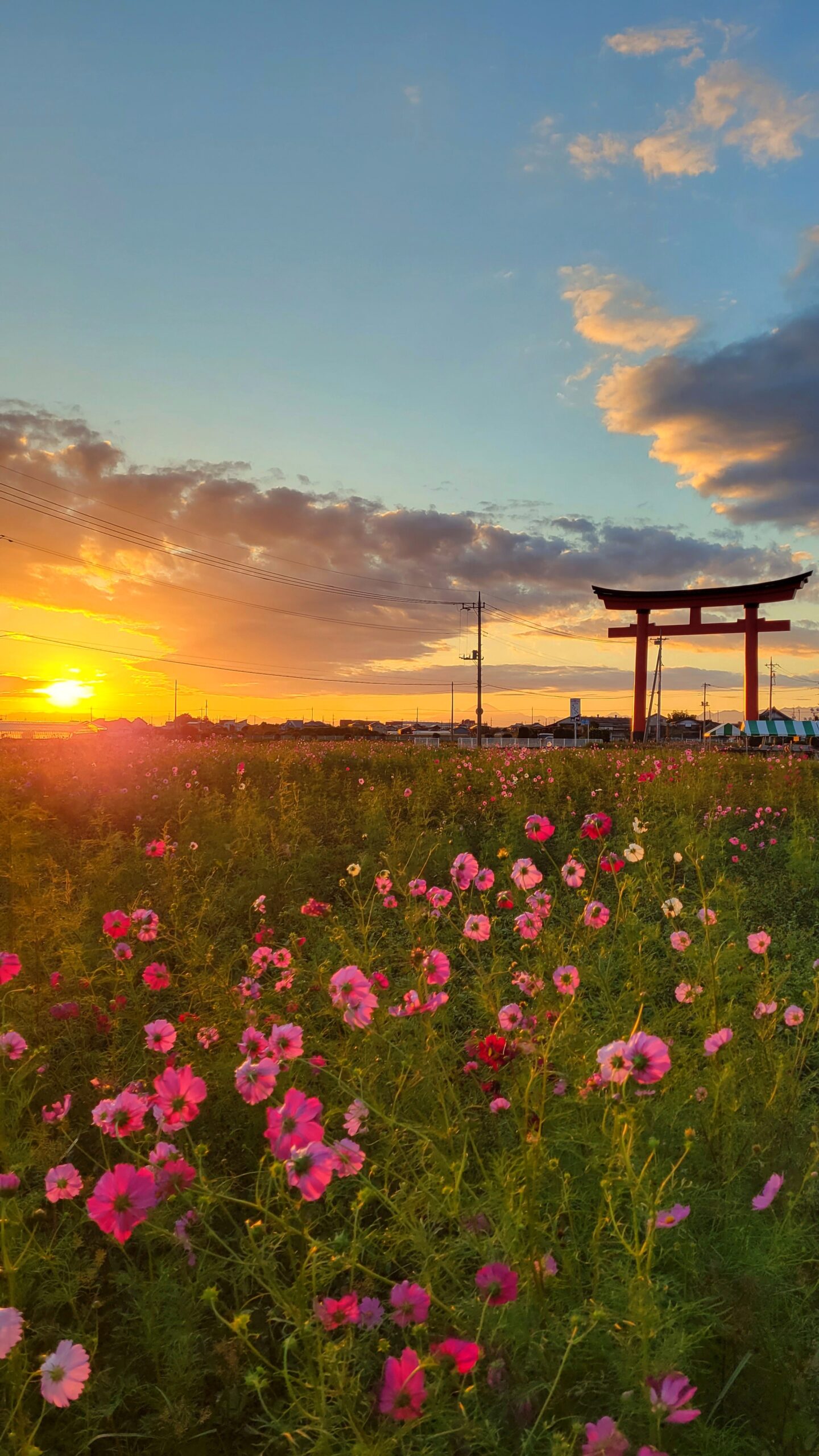 10月 小泉稲荷神社大鳥居|大鳥居とコスモスの優雅な共演 この写真は、夕焼けの時間帯に、大鳥居とコスモスの美しいコラボレーションを撮影しました。 10月2024年2024年10月コスモス小泉稲荷神社大鳥居群馬県花