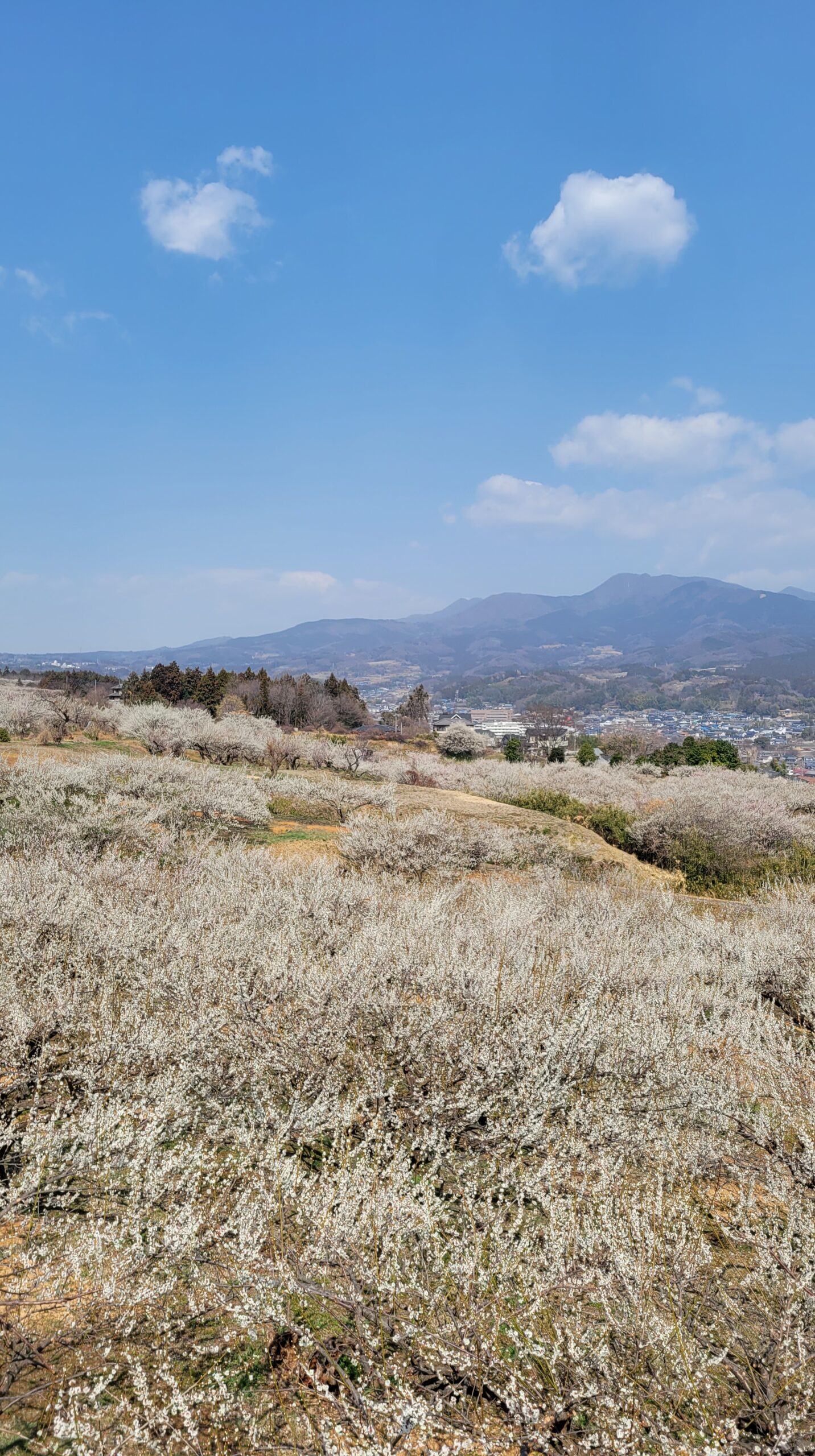 榛名梅林では、見頃を迎えると斜面いっぱいに白梅が咲き誇り、一面がまるで雪景色のように真っ白な風景に包まれます。ふわりと広がる花の香りと、静かな空気に包まれて歩くひとときは、心がすっとほどけていくようです。青空を背景にした白梅の清らかさは、まさに春のはじまりを象徴する光景。斜面の起伏を活かして、見上げても見下ろしても絵になる構図が広がっており、撮影にもぴったりです。