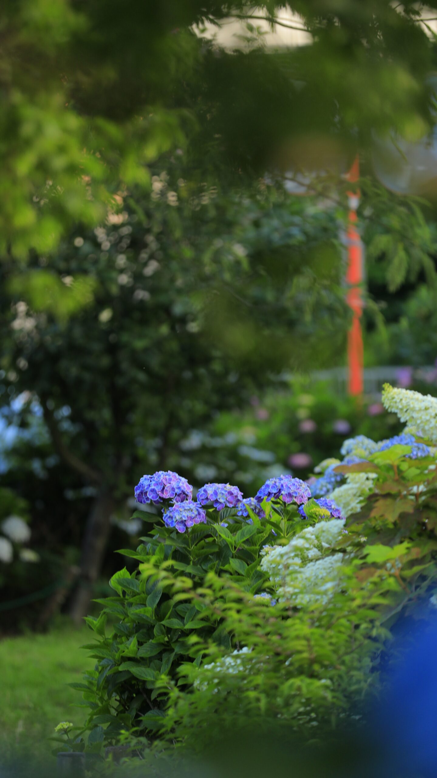 静かな住宅街に佇む小さな緑地公園です。初夏になると園内のあちこちで紫陽花が咲き、落ち着いた雰囲気の中に鮮やかな彩りを添えてくれます。木々の間から差し込む木洩れ日と紫陽花の組み合わせが美しく、ゆっくりと散歩しながら花を楽しむのにぴったりの場所です。