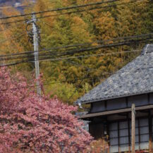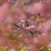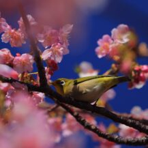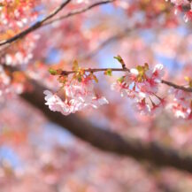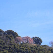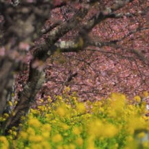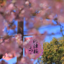 この写真は、河津桜まつり(河津町)で、川に降りて下から河津桜が咲く土手の様子を撮影したもので、見上げる構図で迫力を出しました。