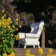 ニューヨークランプミュージアム&フラワーガーデン|菜の花越しの椅子オブジェ