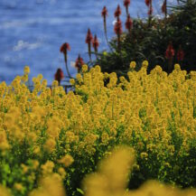 この写真は、ニューヨークランプミュージアム&フラワーガーデンで、菜の花、アロエの花、海の様子を広めの構図で撮影したものです。