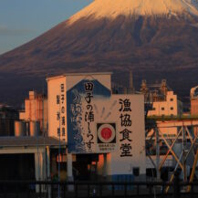 この写真は、田子の浦で、1月1日の大漁旗漁船パレードの前日に、大漁旗と漁協食堂の看板、富士山をあわせて撮影したものです。