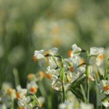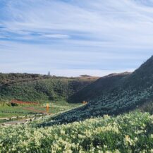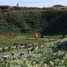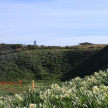 撮影のポイントは、入口付近から灯台へ向かう流れの中で、水仙・丘・灯台・海といった要素をバランスよく配置し、全体をダイナミックに見せることです。爪木崎(下田)では、水仙の群生を前景に入れ、緩やかな丘のラインを活かしながら奥に灯台と海を組み合わせることで、爪木崎らしいスケール感のある構図が作りやすくなります。やや広角気味で狙うと要素同士のつながりが強調され、花だけでなく岬全体の風景として印象的な一枚に仕上がります。