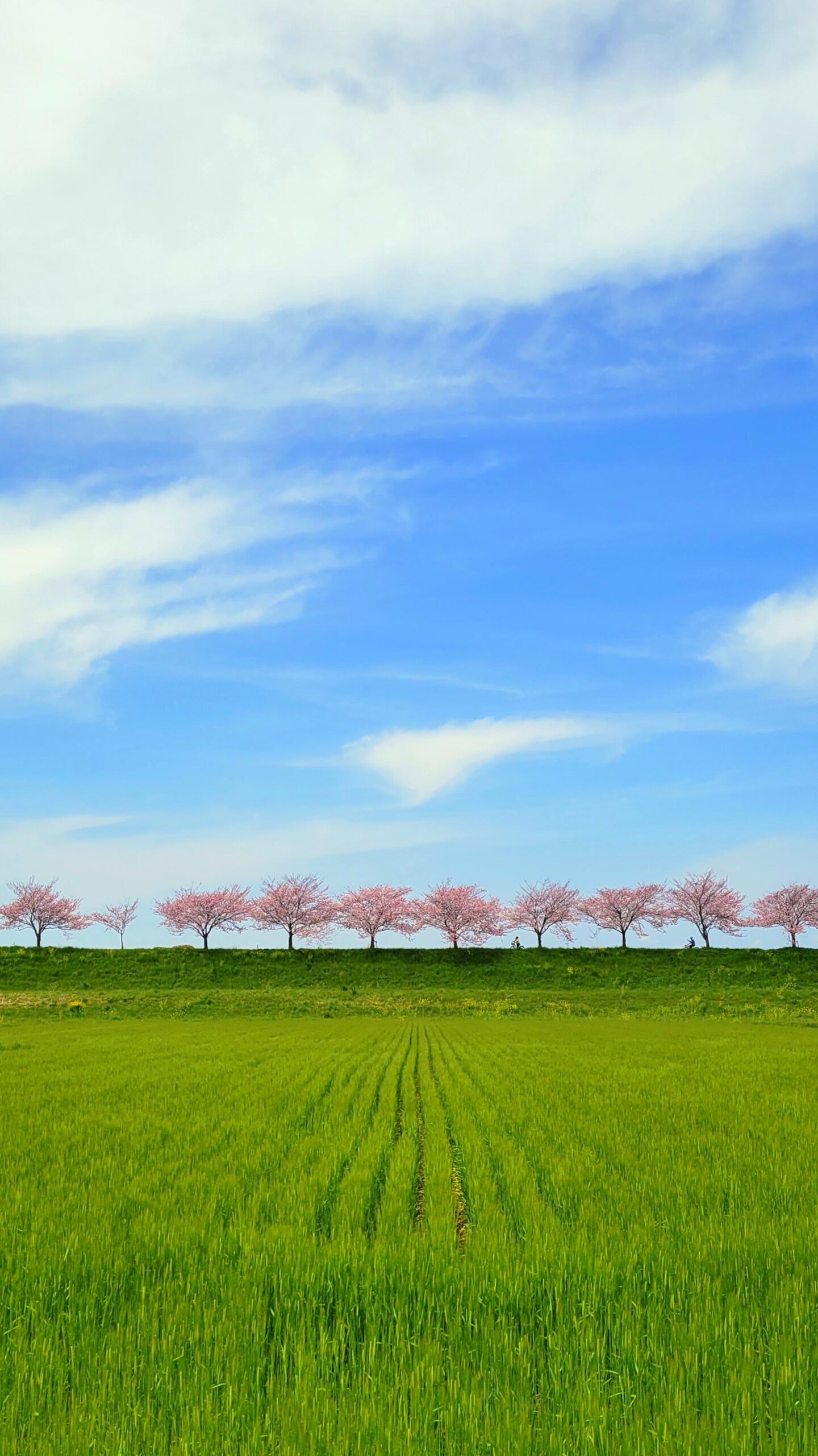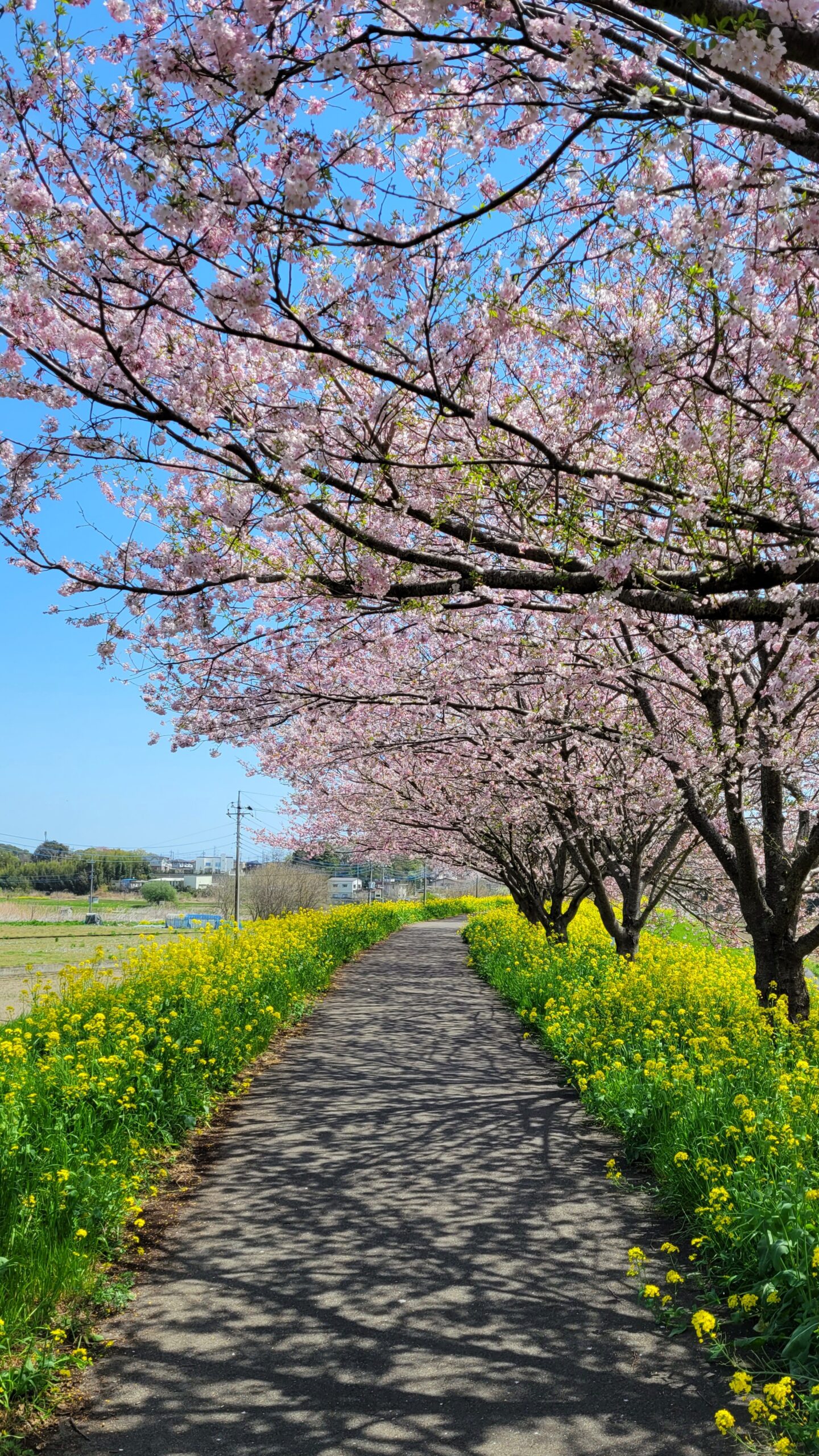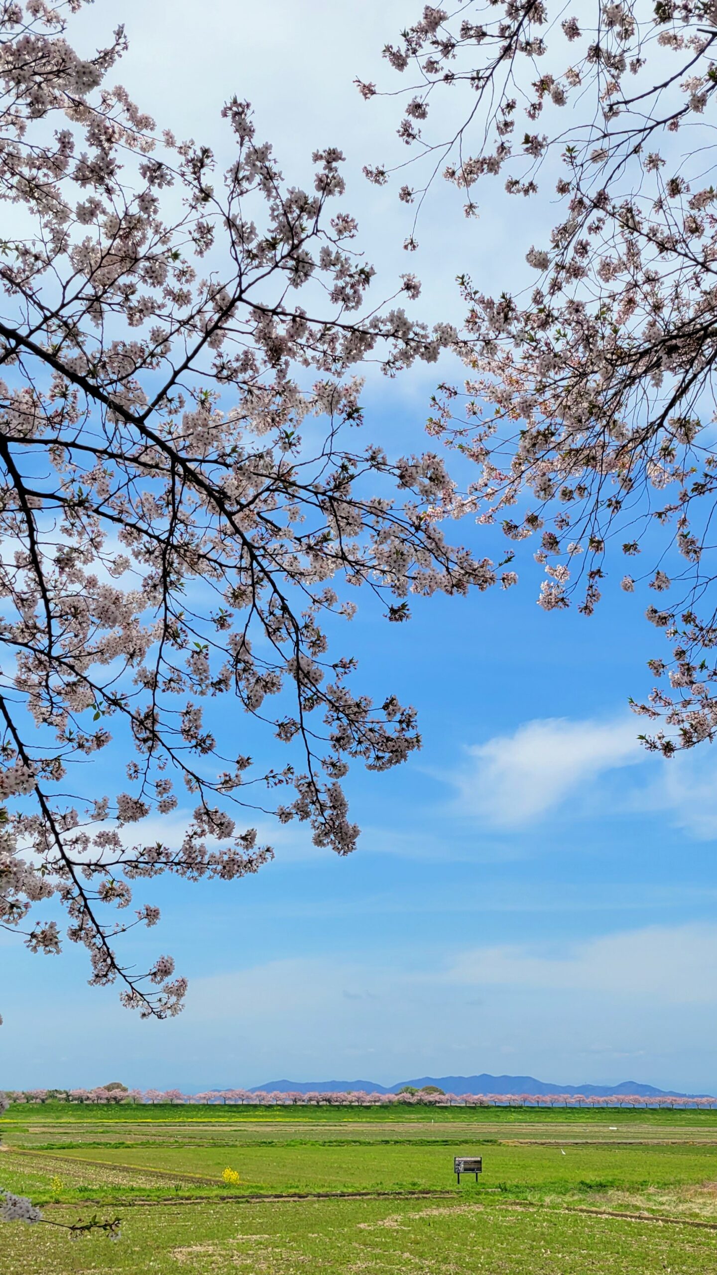 2024年 思川桜堤|思川桜堤の春!桜と菜の花が織りなす絶景のトンネル 栃木県小山市にある桜と菜の花の並木を下の田んぼから見た風景です。田んぼの緑と桜のピンクと空の青が最高のカラーリング 2024年2024年4月4月川思川桜堤栃木県桜花