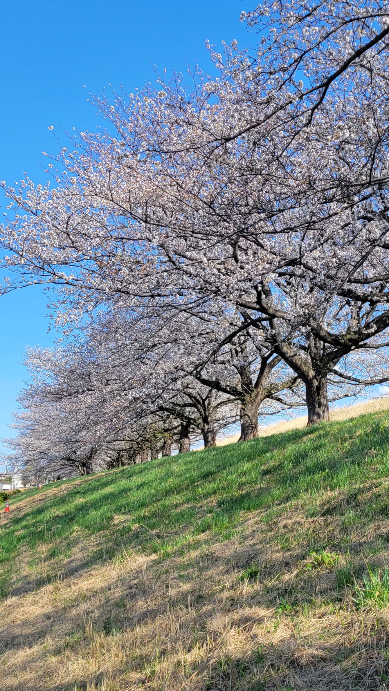 この写真は、晴れ渡る青空のもとで、土手に咲く桜の様子を撮影したものです。