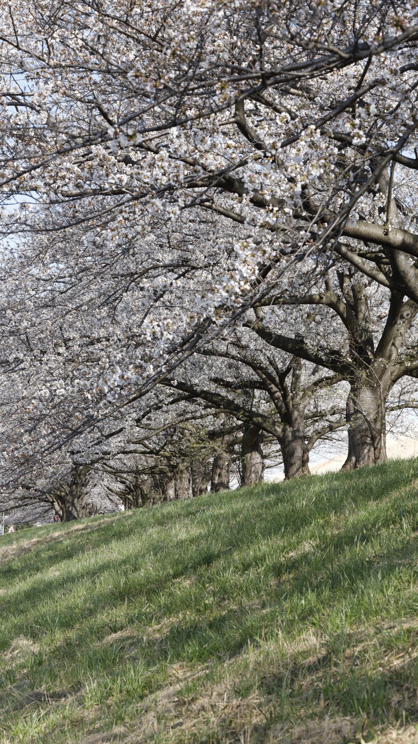 この写真は、戸田ボート前に続く桜並木を、土手の下から見上げるようにして撮影しました。
