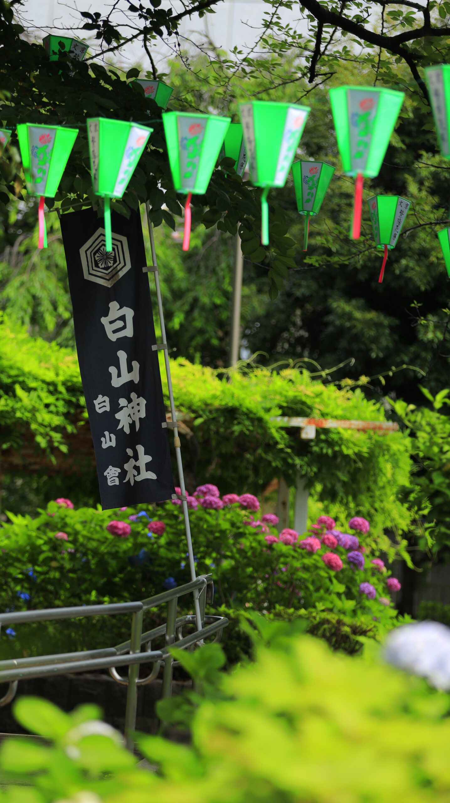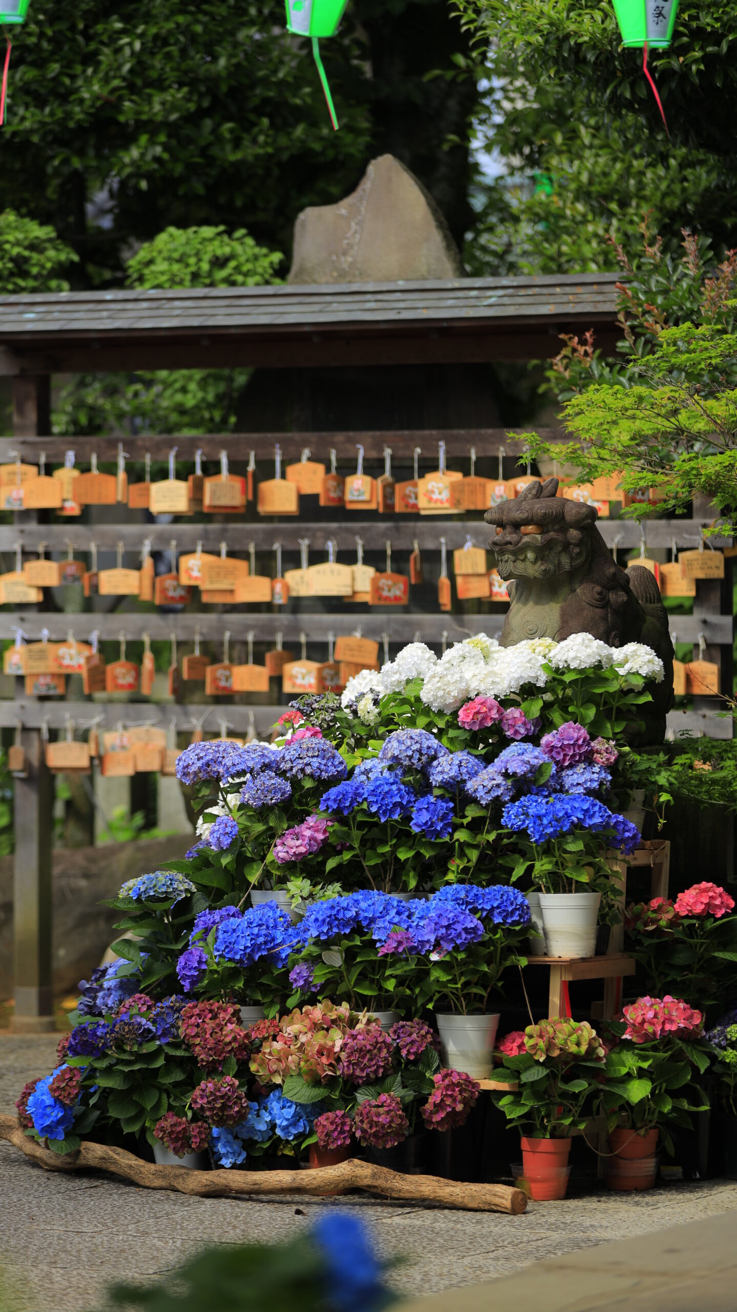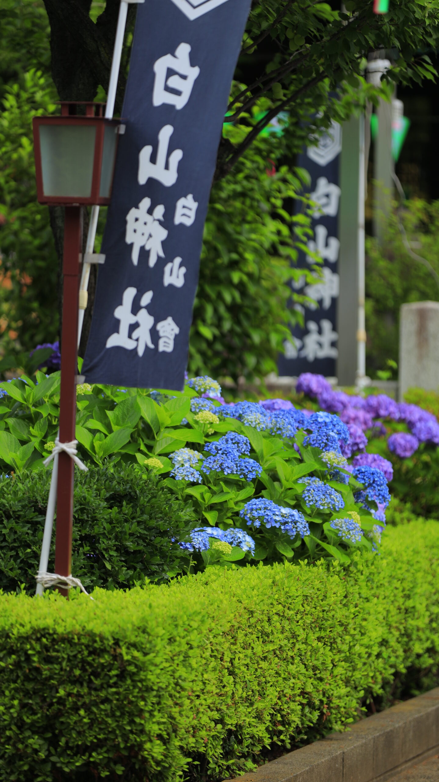 文京区にある白山神社は、都心にありながら季節の花が楽しめる神社として知られており、特に初夏には境内を彩る紫陽花が人気です。毎年開催される「あじさい祭り」では、参道や境内のあちこちに紫陽花が咲き誇り、訪れる人の目を楽しませてくれます。狛犬や絵馬、登り旗といった神社ならではの風景と紫陽花を組み合わせた撮影ができ、和の雰囲気あふれる写真が撮れるのも魅力のひとつです。