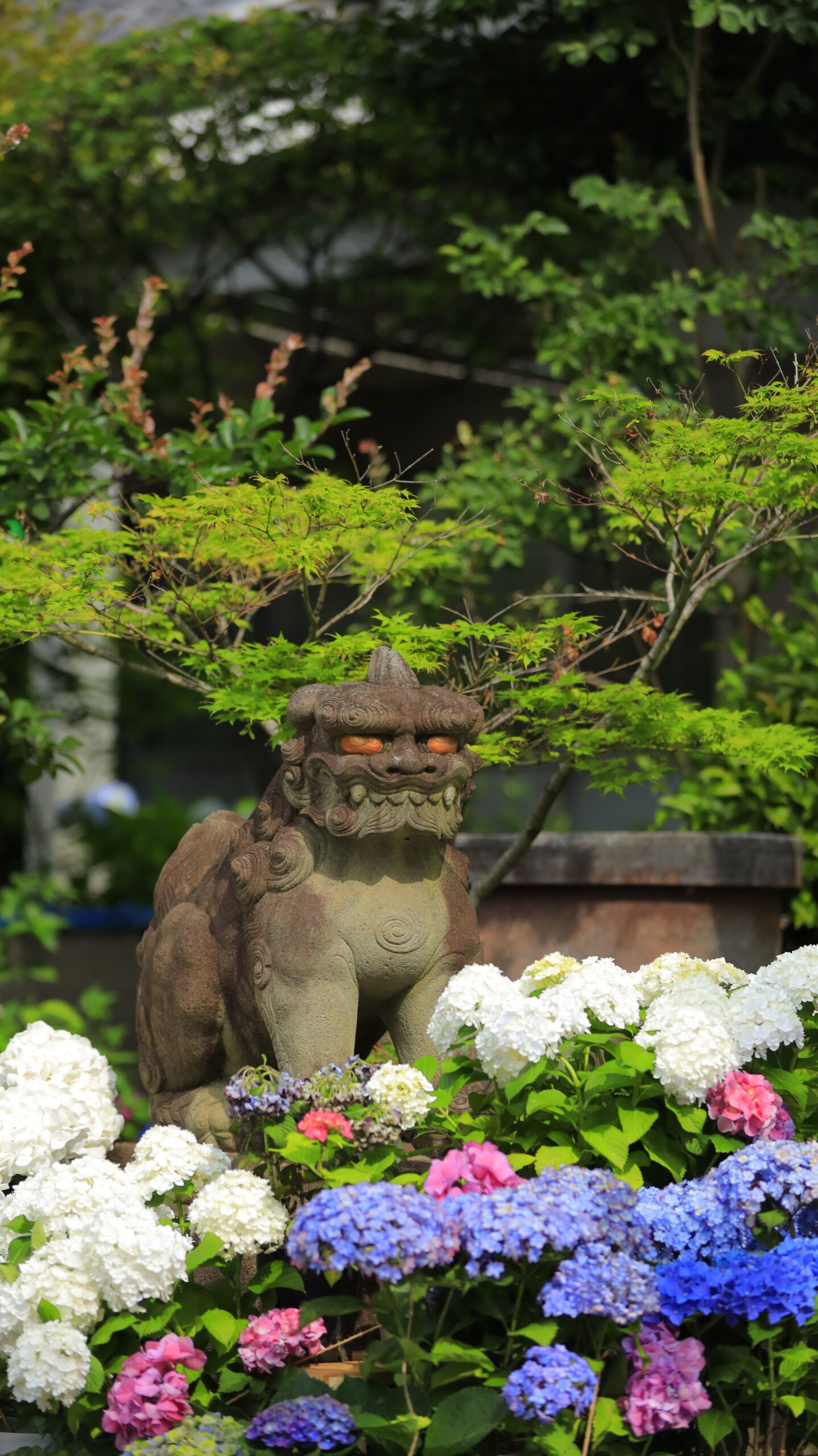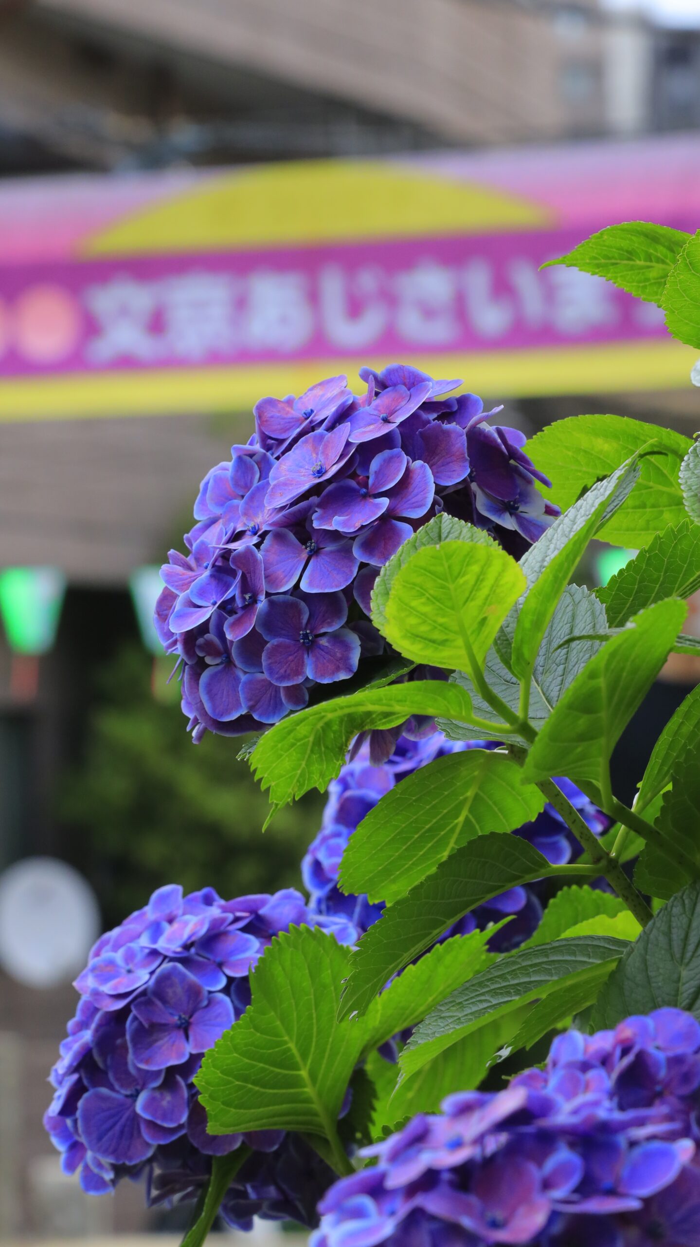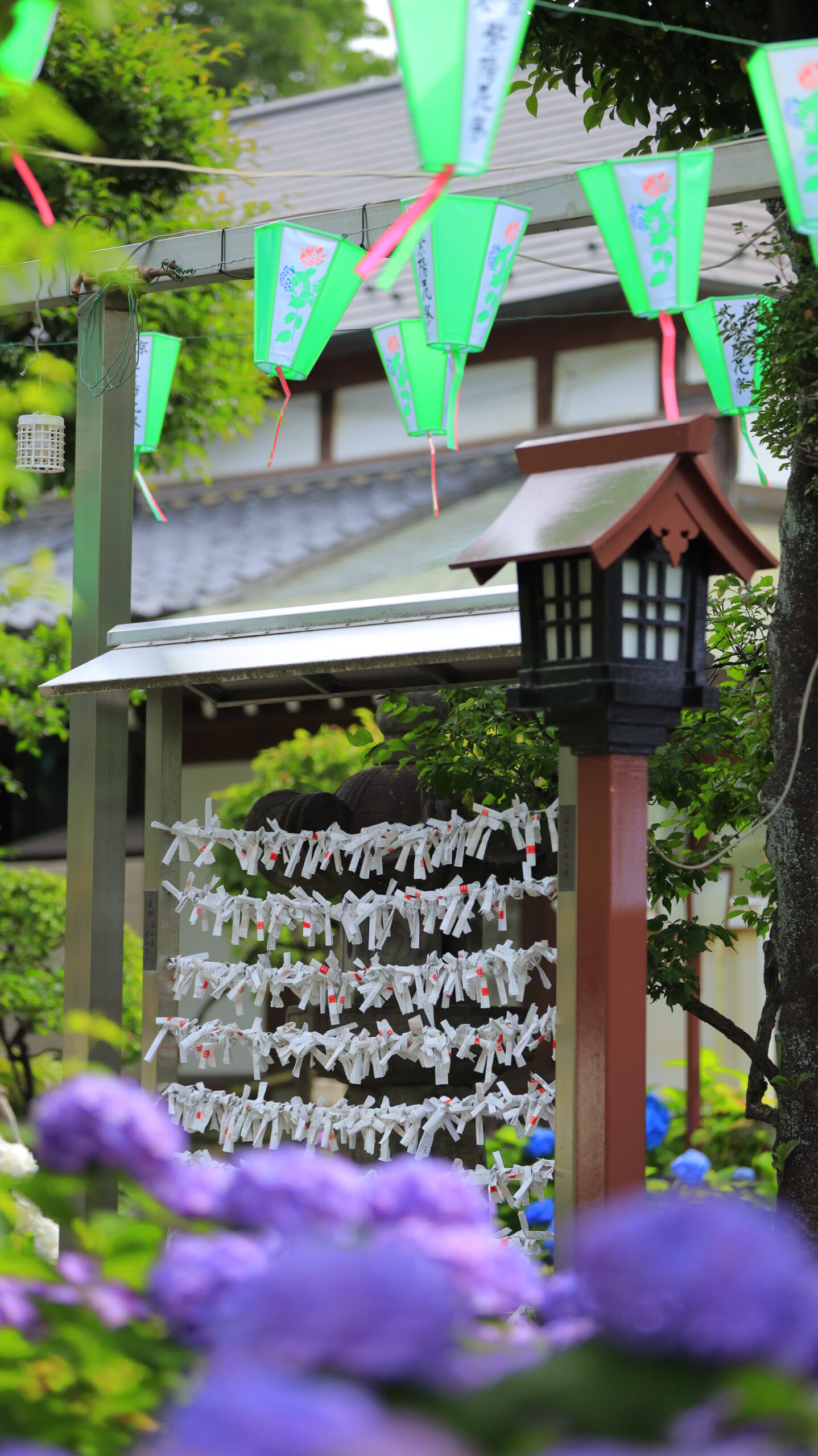 文京区にある白山神社は、都心にありながら季節の花が楽しめる神社として知られており、特に初夏には境内を彩る紫陽花が人気です。毎年開催される「あじさい祭り」では、参道や境内のあちこちに紫陽花が咲き誇り、訪れる人の目を楽しませてくれます。狛犬や絵馬、登り旗といった神社ならではの風景と紫陽花を組み合わせた撮影ができ、和の雰囲気あふれる写真が撮れるのも魅力のひとつです。