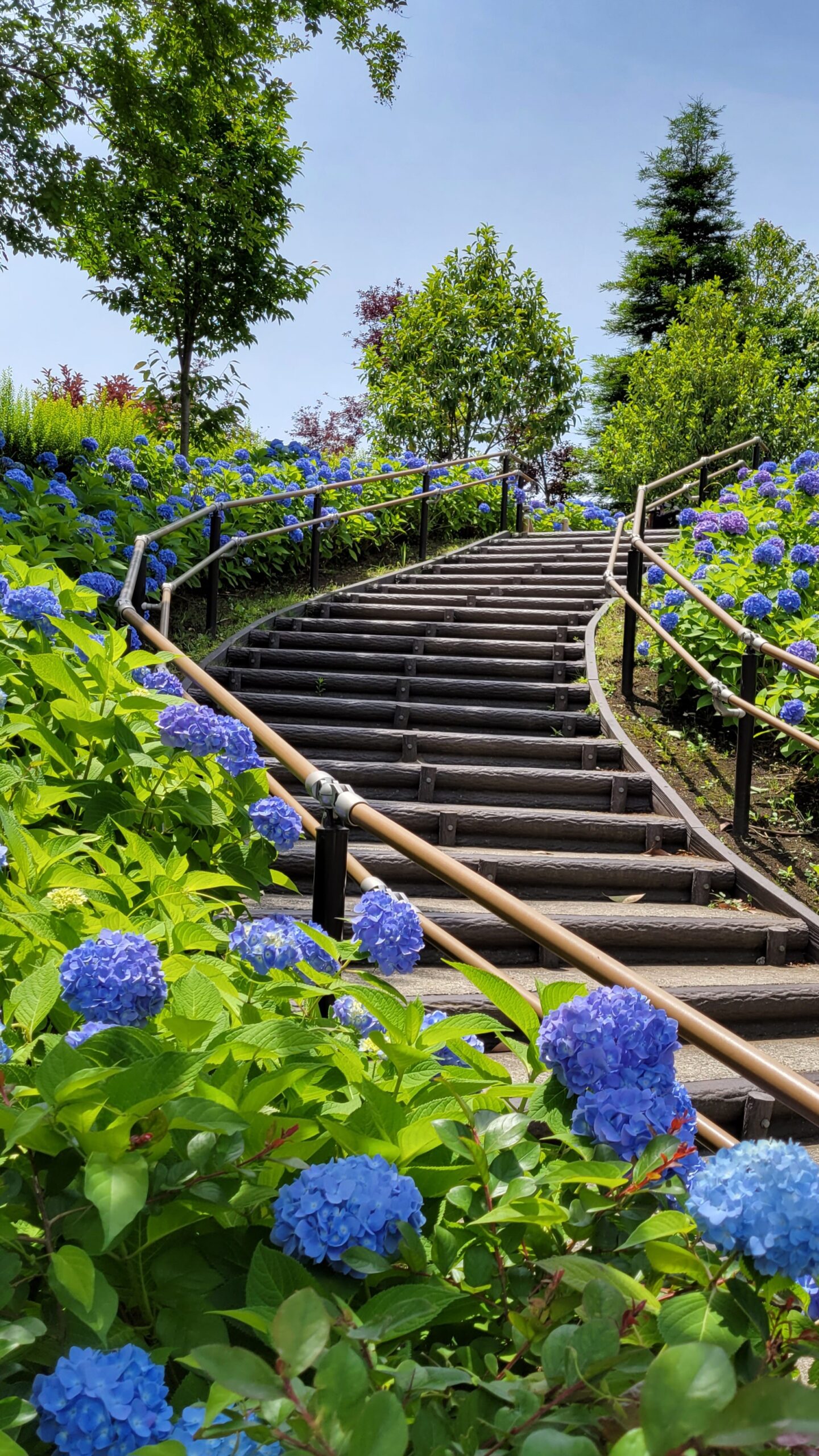 2023年 シンボルプロムナード公園|青空と紫陽花の共演!お台場シンボルプロムナード公園の魅力 お台場のシンボルプロムナード公園より、階段の両脇に咲く、青い紫陽花です。 2023年2023年5月5月シンボルプロムナード公園公園・テーマパーク・建物東京都紫陽花花