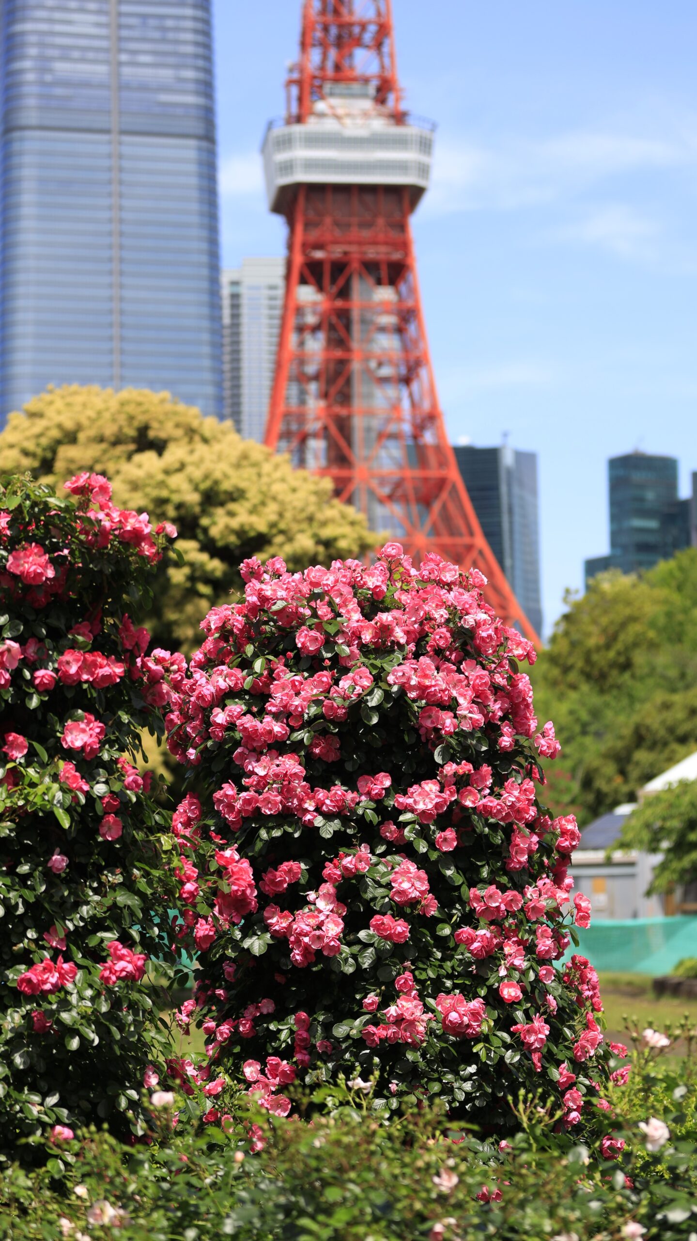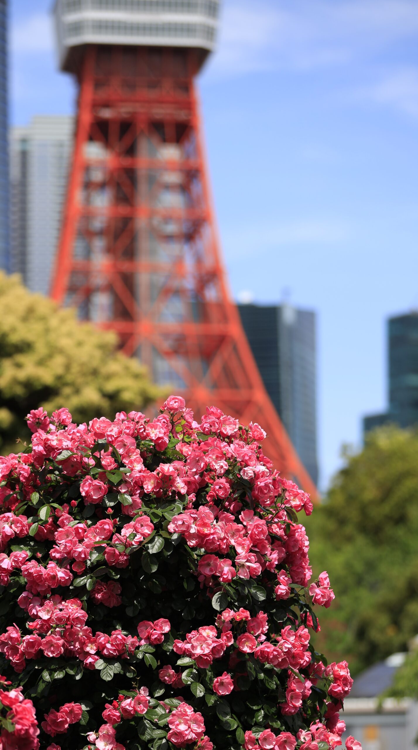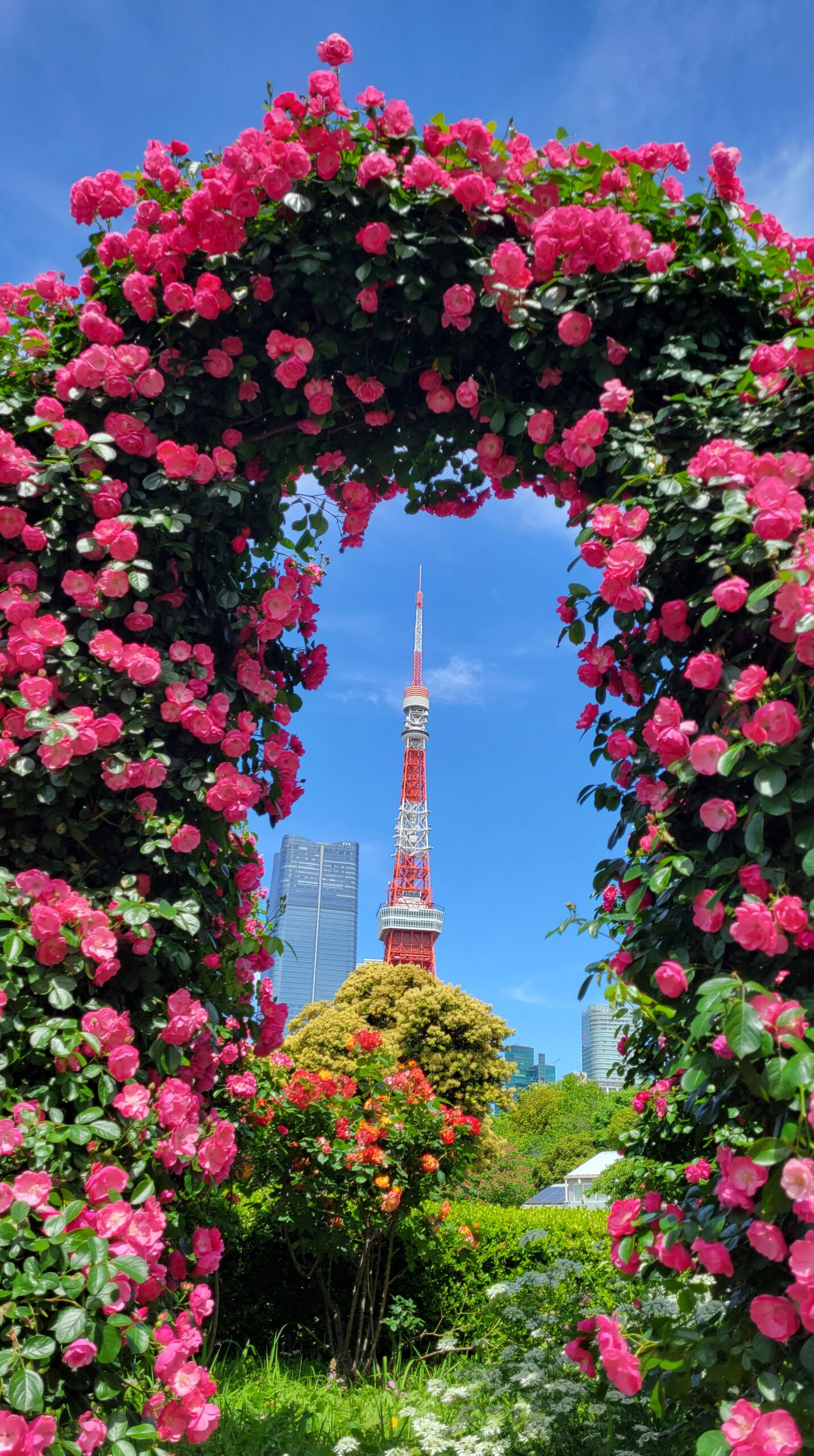 芝公園は、東京タワーを背景にピンクの薔薇のアーチを楽しめる美しい撮影スポットです。この場所では、アーチの中に東京タワーを収める構図で撮影することができ、まるで薔薇が東京タワーを包み込むような、ロマンティックな一枚を狙えます。特に夕方の時間帯には、夕焼けの柔らかな光が薔薇とタワーを照らし、幻想的で美しいコントラストが生まれます。ピンクの薔薇のアーチ越しに見る東京タワーは、都会のシンボルと自然が調和した唯一無二の光景を提供してくれます。