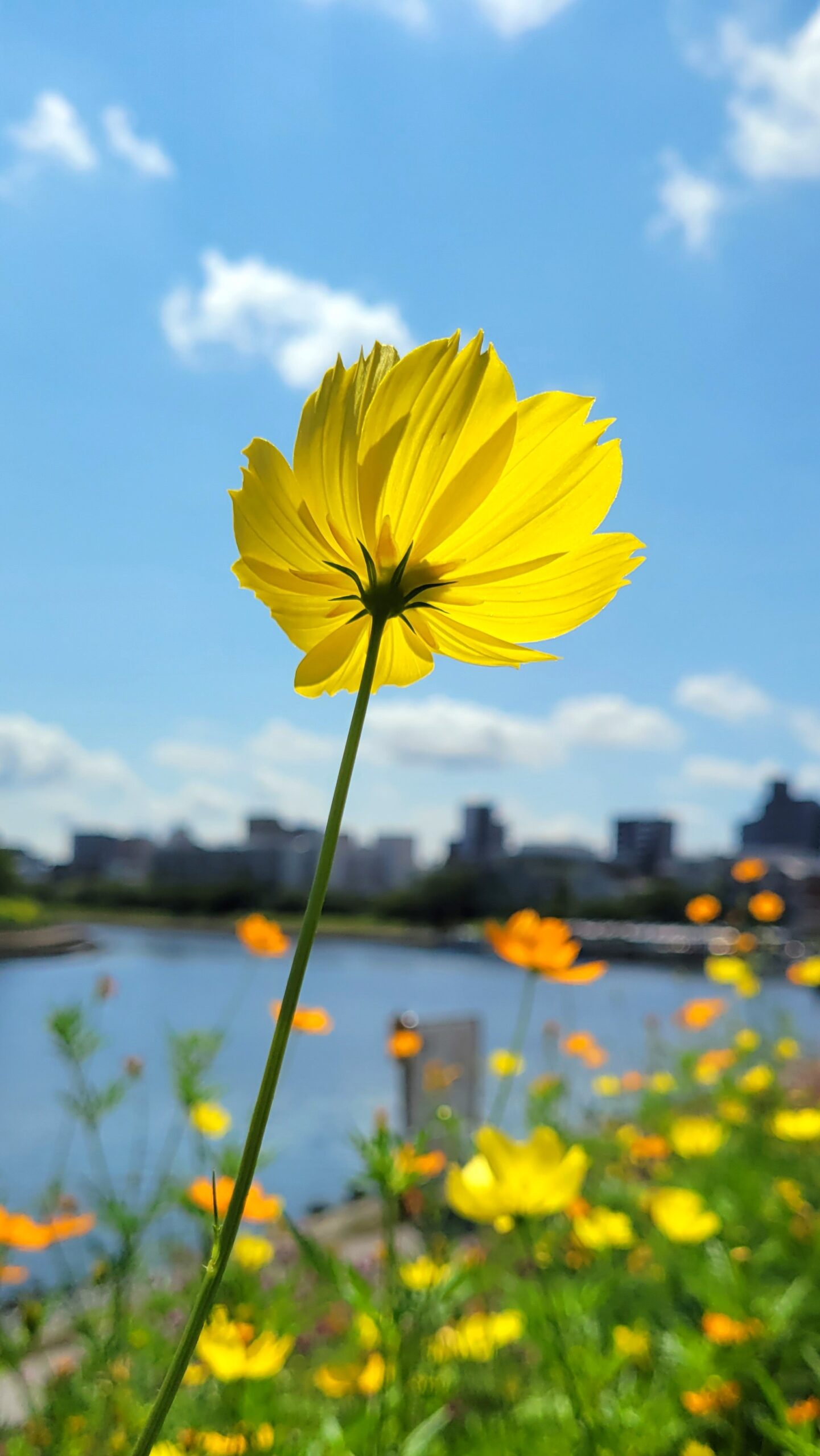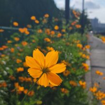 しながわ花海道では、黄色とオレンジ色のキバナコスモスが川沿いに美しく咲き誇り、秋の風景に彩りを添えています。川の流れと共に揺れるコスモスは、自然の美しさと穏やかな雰囲気を感じさせる、心癒される光景です。家族や友人と一緒にゆったりと散策しながら、爽やかな秋のひとときを過ごしてみてください。写真愛好家にもおすすめのスポットで、川とコスモスのコラボレーションが印象的な一枚を撮影できるでしょう。海に近いため、風が強い日もあります。できるだけ風の少ない日に訪れることをおすすめします。