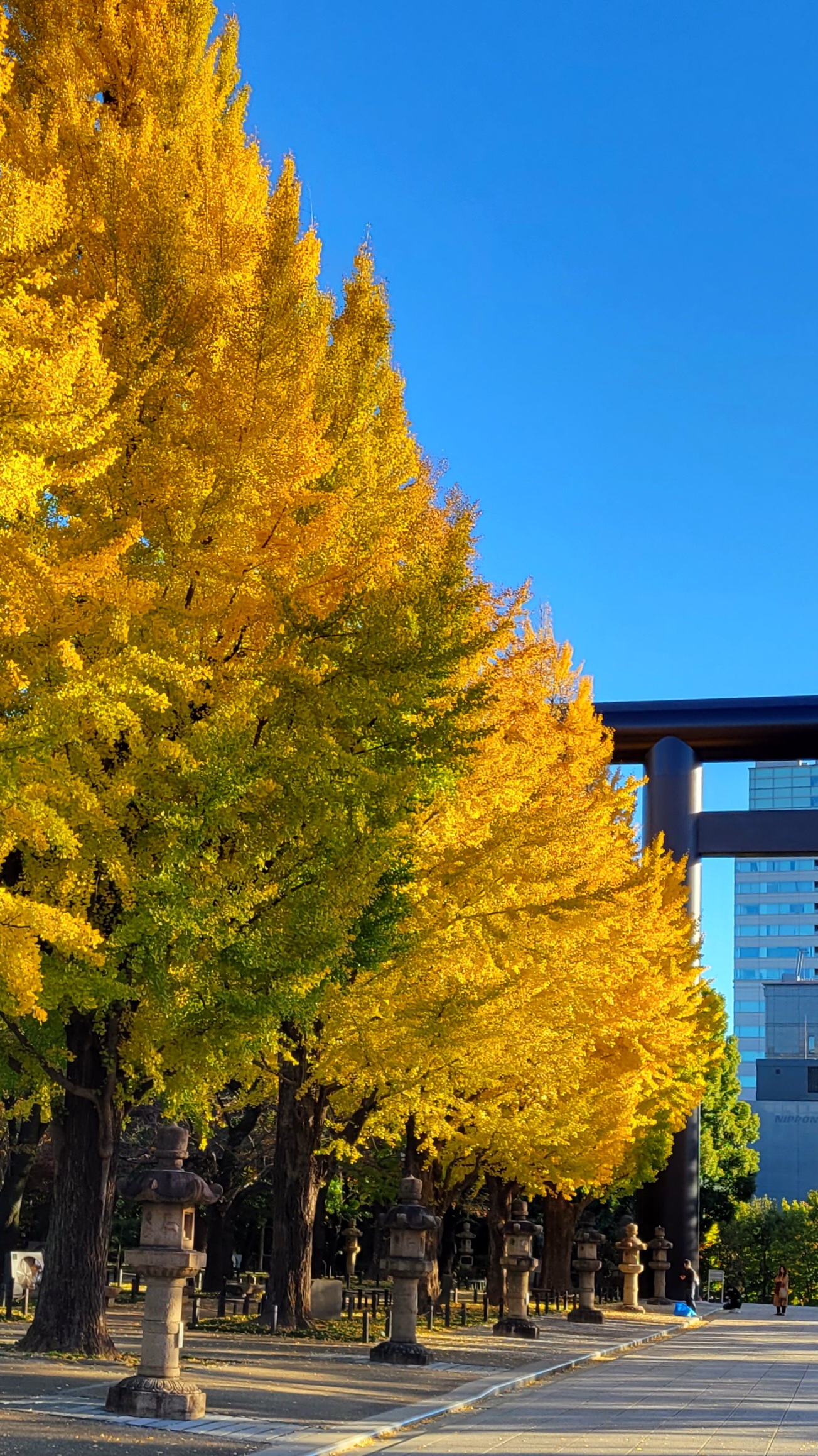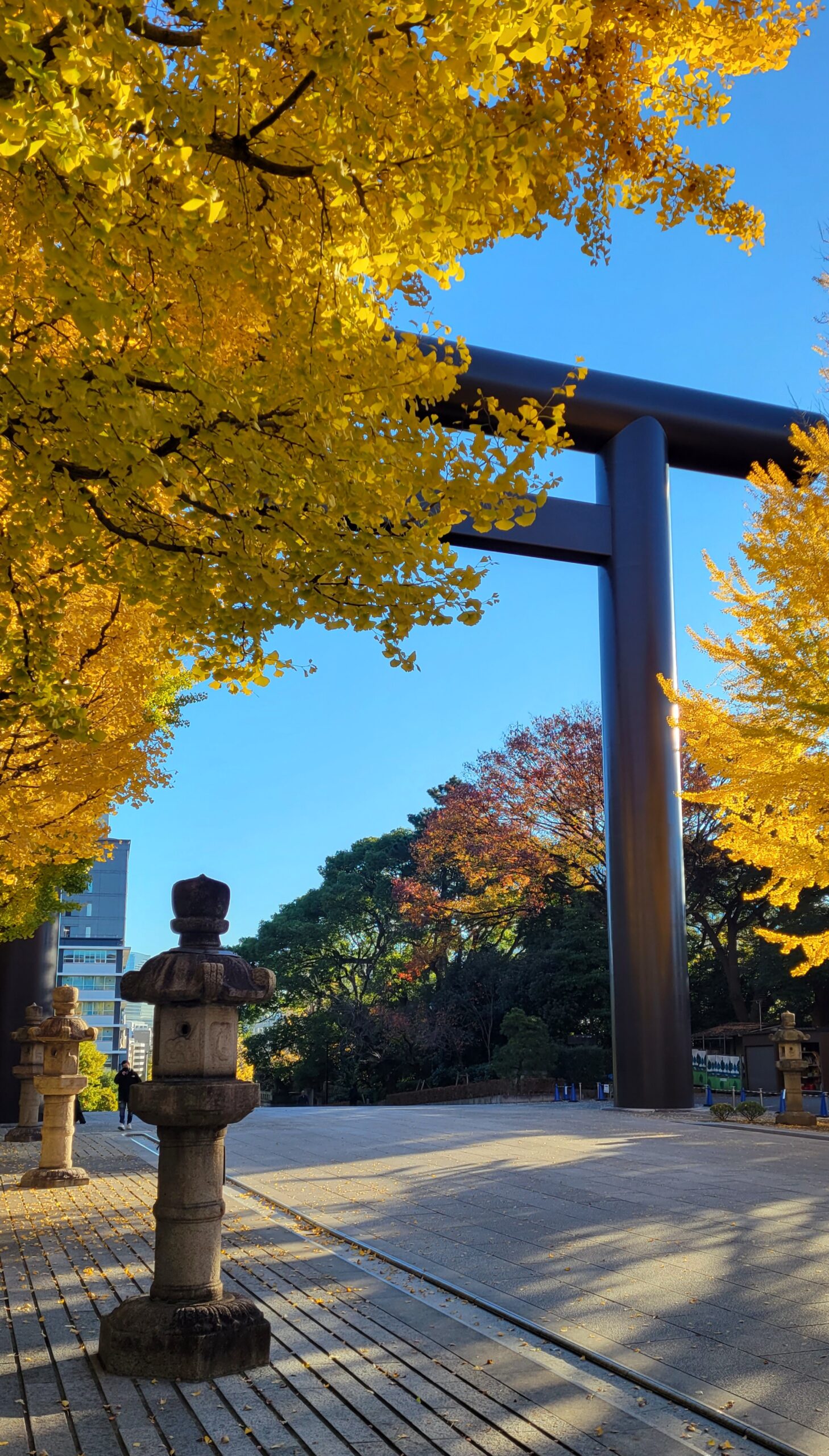 東京都千代田区にある靖国神社は、秋になるとイチョウが鮮やかな黄金色に染まり、訪れる人々を楽しませてくれる紅葉の名所です。境内に立ち並ぶ大きなイチョウの木々が一斉に色づき、秋らしい風情あふれる景色を演出します。