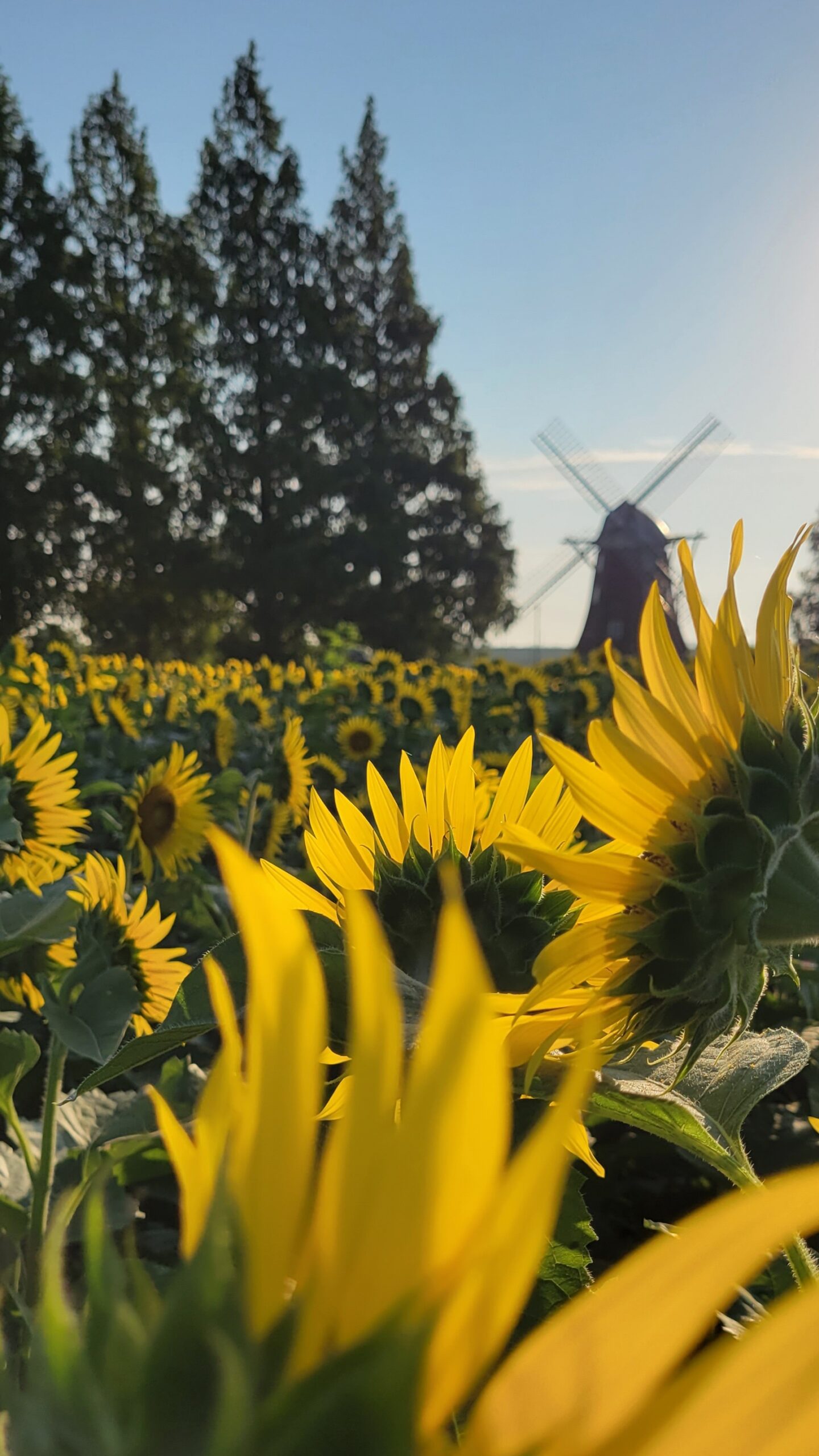 2024年 あけぼの山農業公園|透ける花びらと風車が織りなす美しい風景 太陽が少し出てから、向日葵の花びらが透けるのを撮影しました。手前より3つ目の向日葵を正面にして、ピントを合わせ、手前の向日葵をぼかして撮影しました。2024年、向日葵が同じ方向を向いていなかったのが残念でした。 2024年2024年7月7月あけぼの山農業公園公園・テーマパーク・建物千葉県向日葵(ひまわり)花