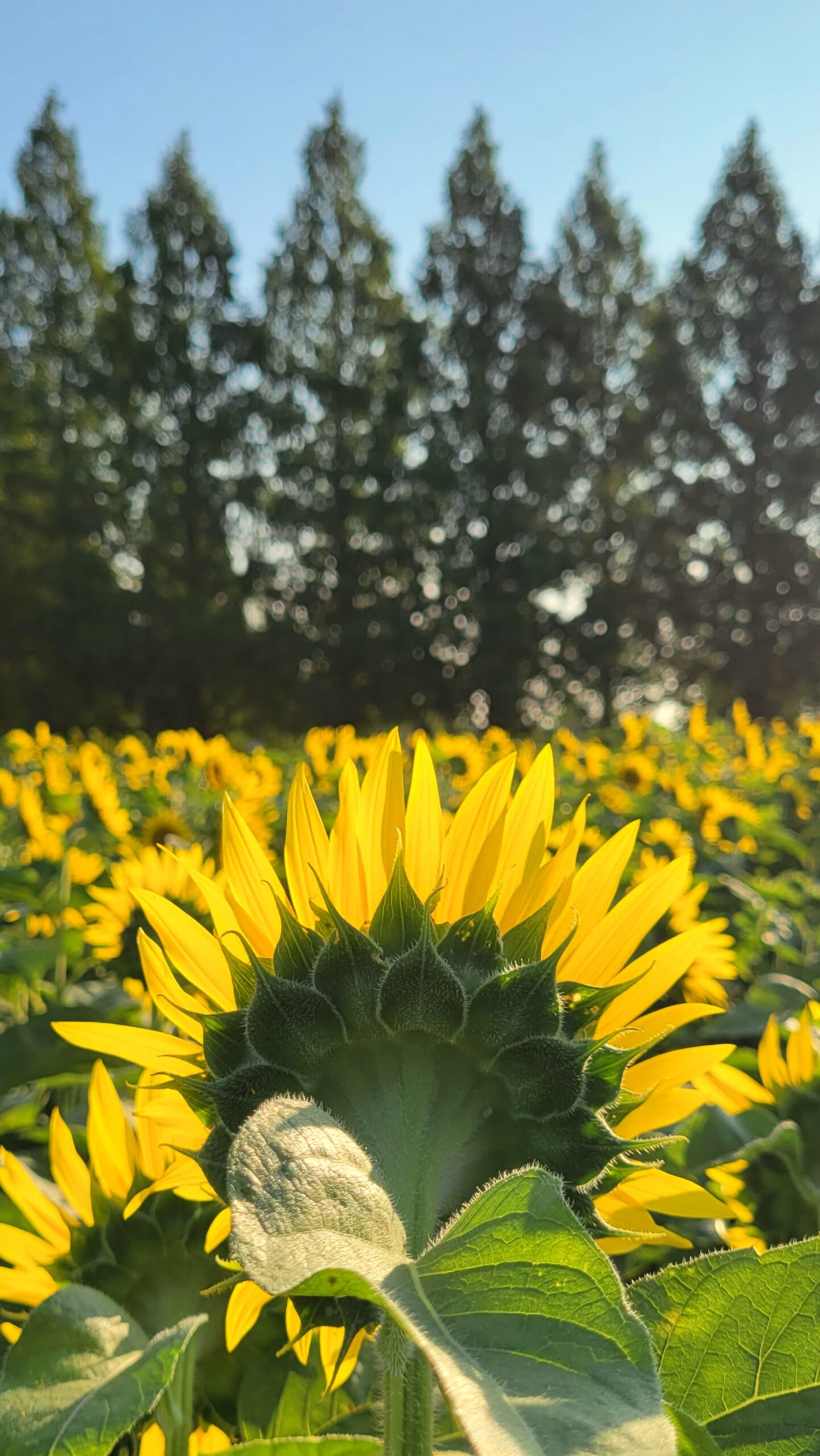 2024年 あけぼの山農業公園|左右対称が美しい向日葵の一瞬 向日葵を正面から裏側まで撮影し、花びらを透かしてみました。奥にあるメタセコイアの木と向日葵が平行になるように撮影してみました。 2024年2024年7月7月あけぼの山農業公園公園・テーマパーク・建物千葉県向日葵(ひまわり)花