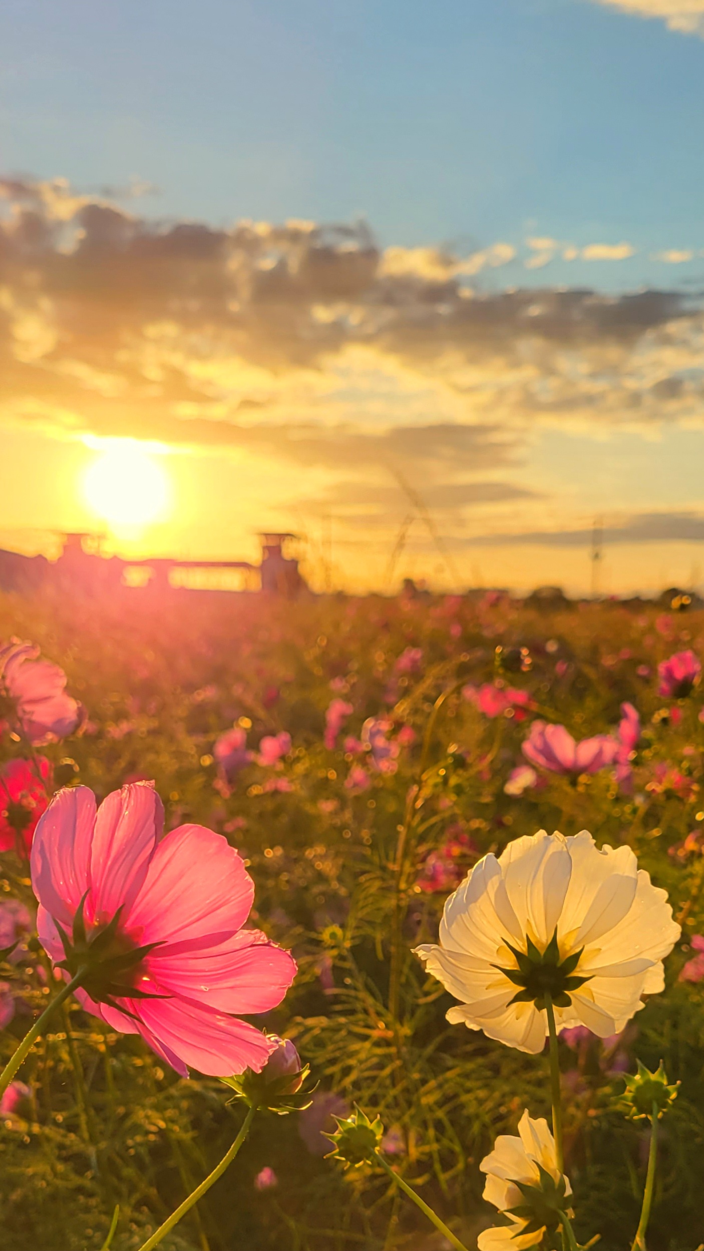 10月 木更津武田川コスモスロード|満開のコスモスとお祭りののぼり旗 この写真は、満開に咲き誇るコスモスとお祭りの雰囲気を感じさせるのぼり旗を一緒に撮影しました。 10月2024年2024年10月コスモス千葉県木更津武田川コスモスロード花
