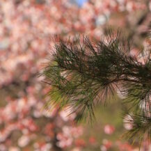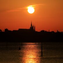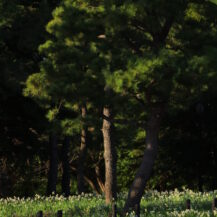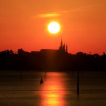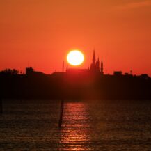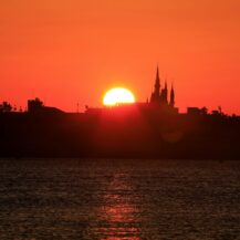 この写真は、葛西臨海公園で、日の出の瞬間に太陽が半分ほど顔を出したタイミングと、遠くに見えるシンデレラ城を重ねるように撮影したものです。