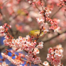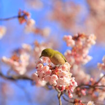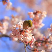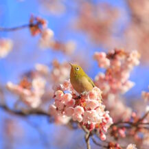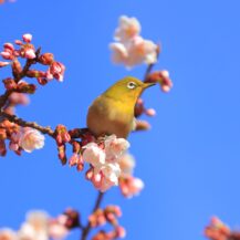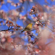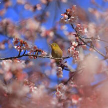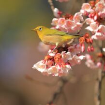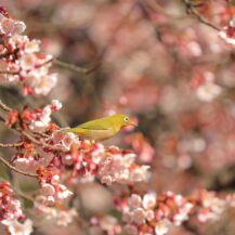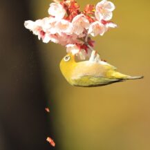この写真は、新宿御苑で、メジロが羽を大きく広げ、今にも飛び立ちそうな瞬間を撮影したものです。