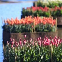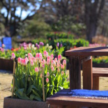 この写真は、国営ひたち海浜公園で、テラスの手前の薄ピンク色のアイスチューリップにピントをあわせて撮影したものです。