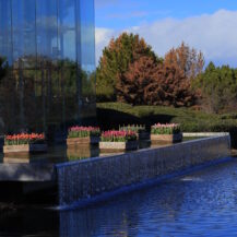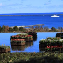 この写真は、国営ひたち海浜公園で、カフェテラスの池のアイスチューリップの鉢の様子を撮影したものです。