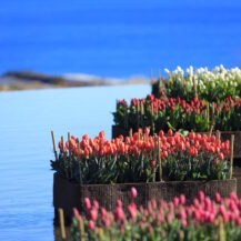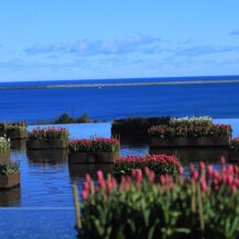 この写真は、国営ひたち海浜公園で、テラスの中からアイスチューリップの花壇にピントをあわせて、海と一緒に撮影したものです。