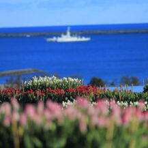 この写真は、国営ひたち海浜公園で、手前のピンクの花をぼかして、後ろのアイスチューリップと海と船を撮影したものです。