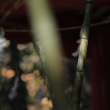 この写真は、熱海梅園で、少し離れた位置から咲き始めた枝垂れ梅の様子を撮影したものです。