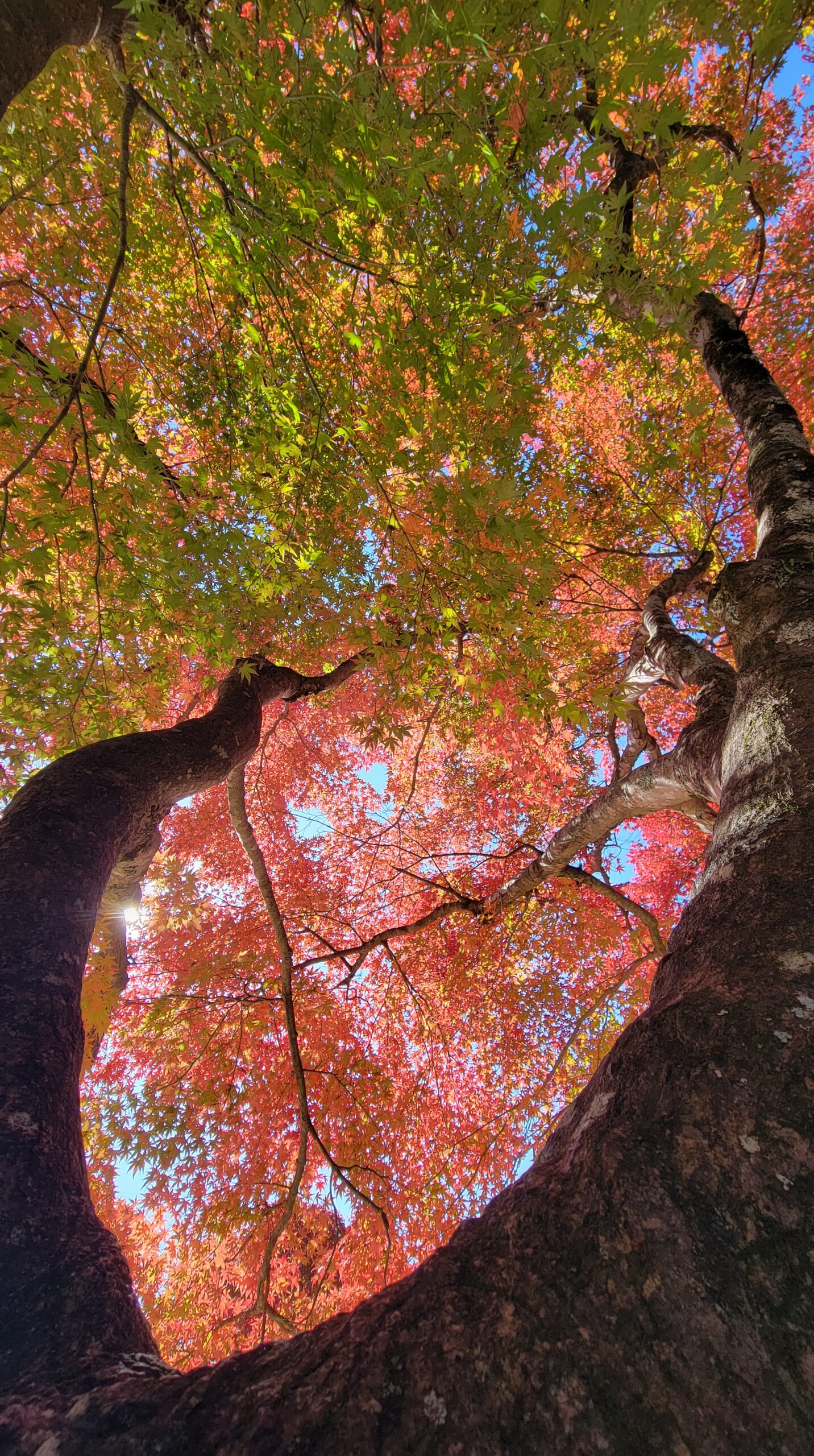 This photo was taken looking up from below at the colored maple leaves on Mt. Takao. The leaves, illuminated by the clear light, are reflected in the sky, reminding us of the deepening of autumn.