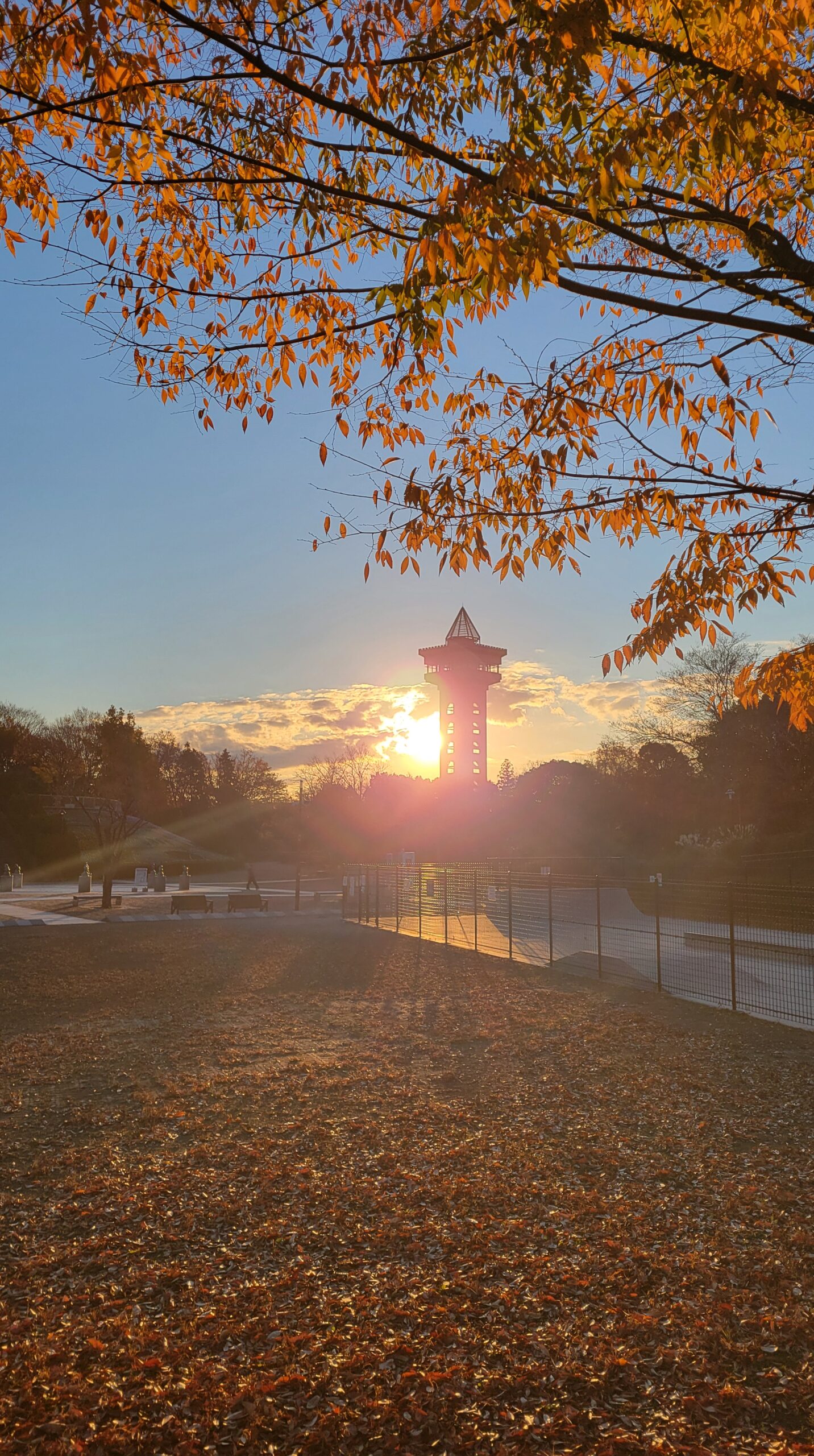 This photo was taken at Sagamihara Park, aiming for the sunrise from beneath a zelkova tree, with the Green Tower Sagamihara (observation tower) captured as a silhouette. The composition allows you to feel the clear morning air and the quiet spread of light.