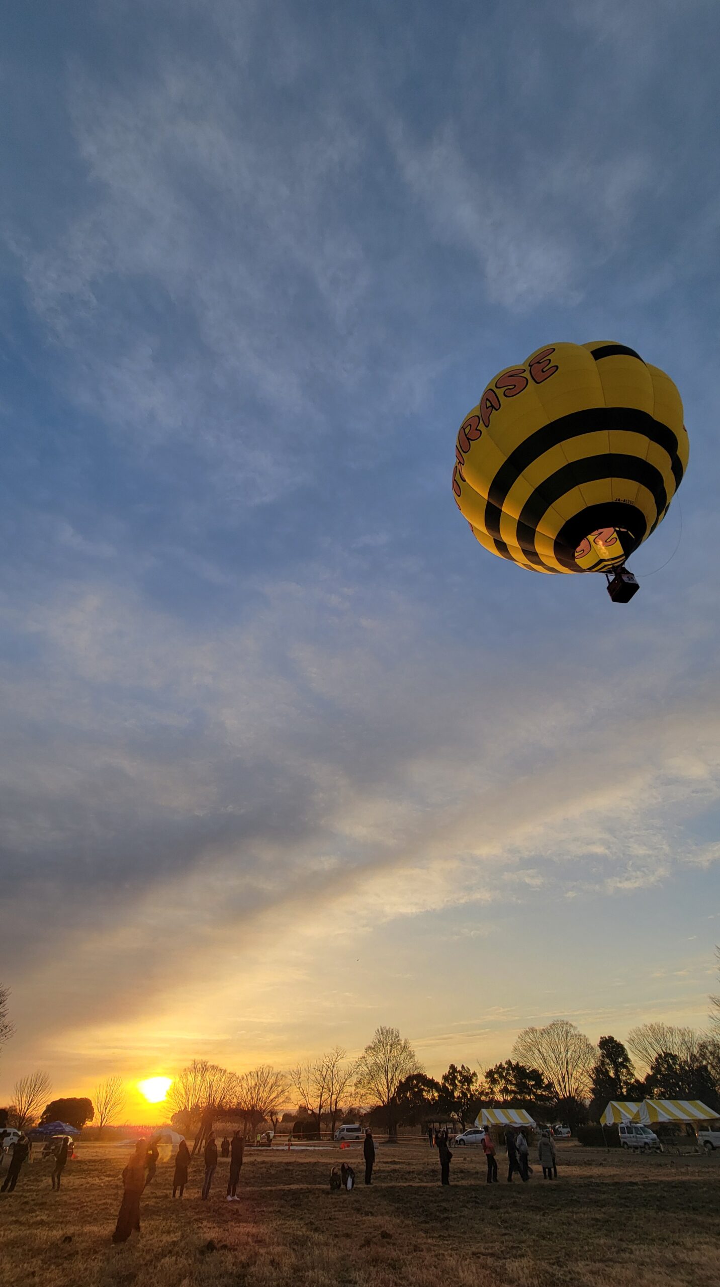 This photograph captures the hot air balloons beginning to rise into the sky at the Watarase Balloon Race, timed to coincide with sunrise, along with the spreading morning light.