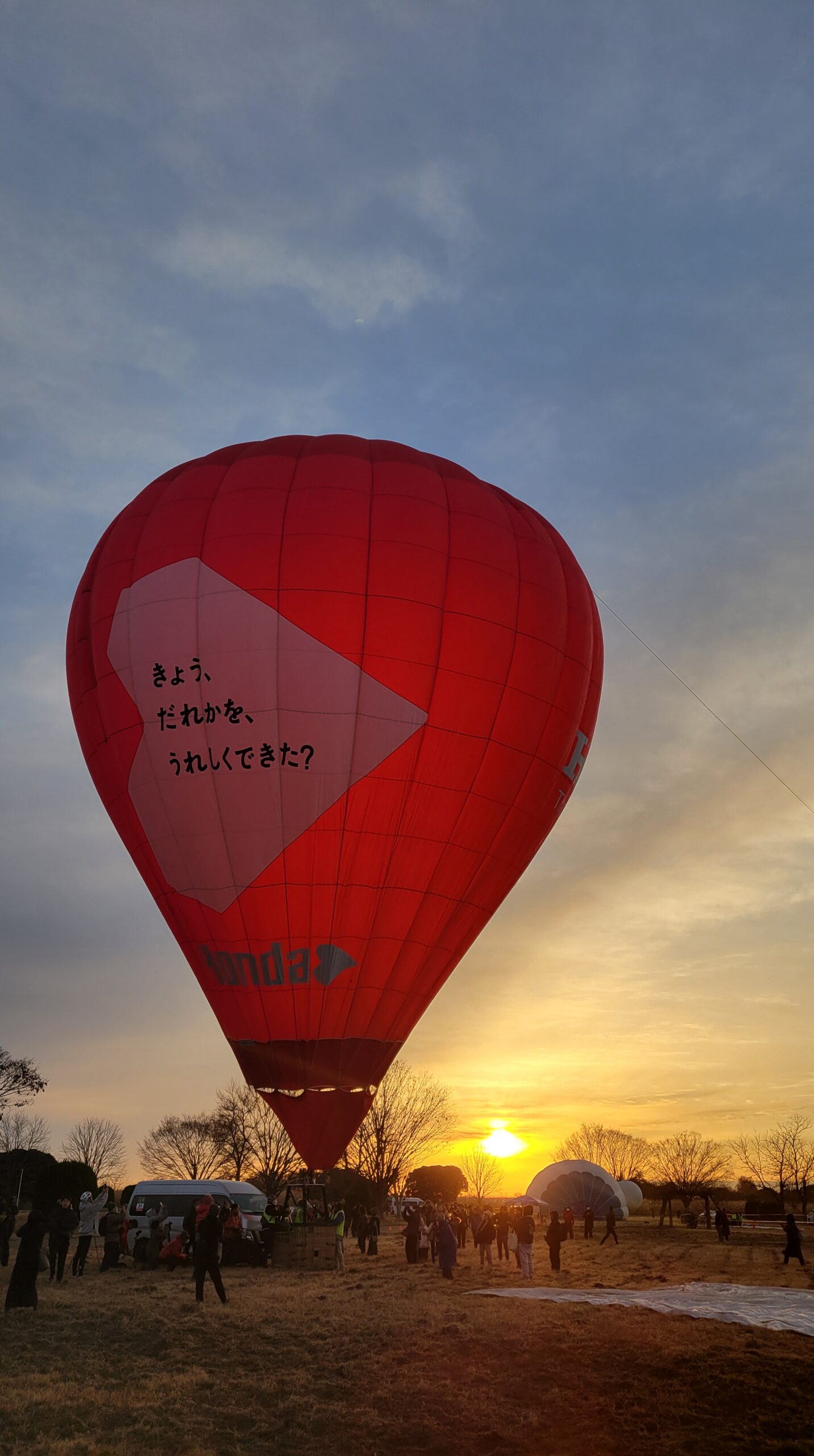 This photograph was taken at the Watarase Balloon Race, capturing the moment when the red balloon overlapped with the rising morning sun.