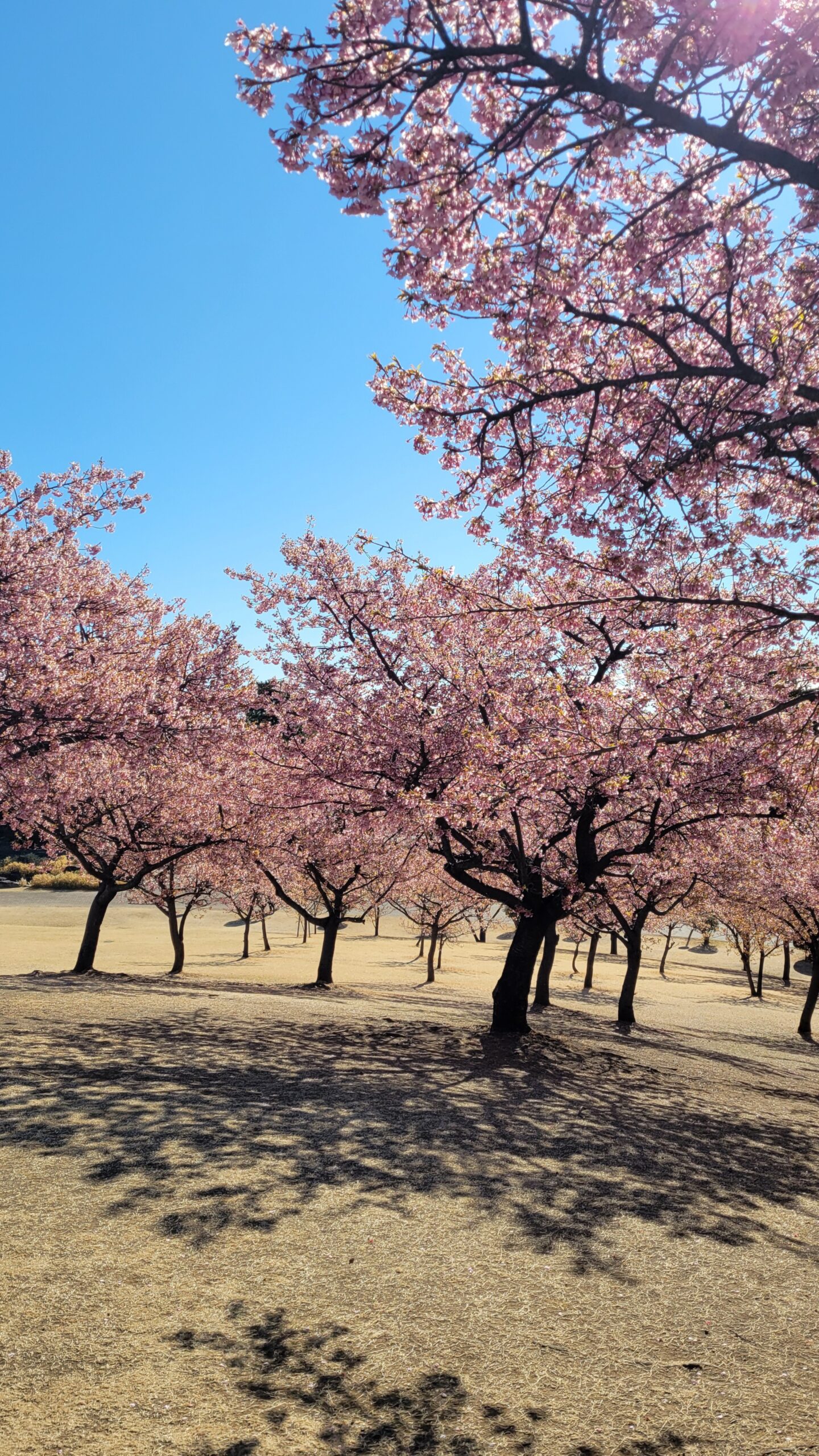 この写真は、伊勢崎市みらい公園で、小さな丘の上から下に向かって視線を落としながら、河津桜の林を見下ろす構図で、公園全体に広がる桜の景色を意識して撮影したものです。