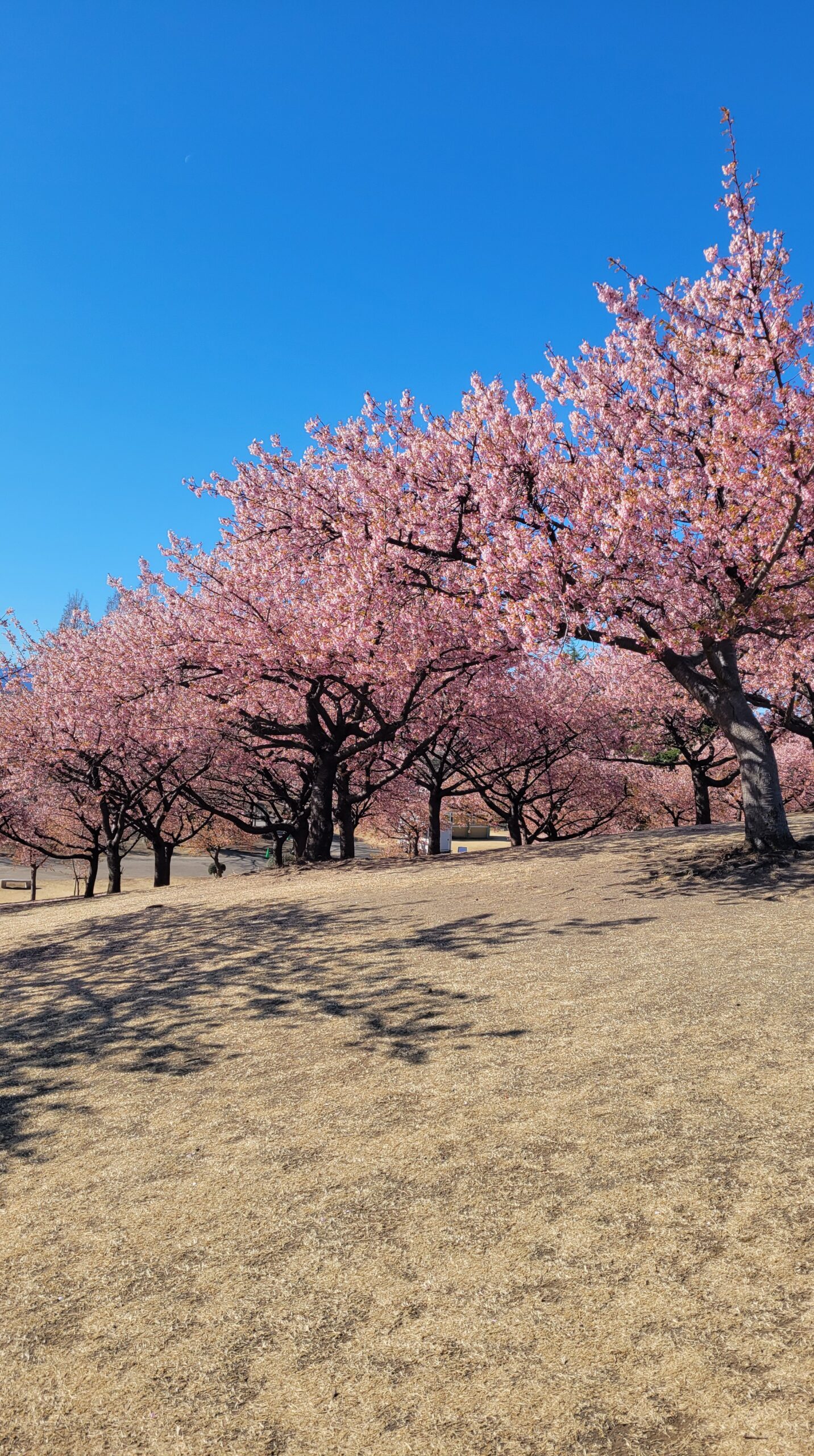 伊勢崎市みらい公園で、丘の上に咲くピンクの河津桜と真っ青な青空のコントラストが美しい春の風景。