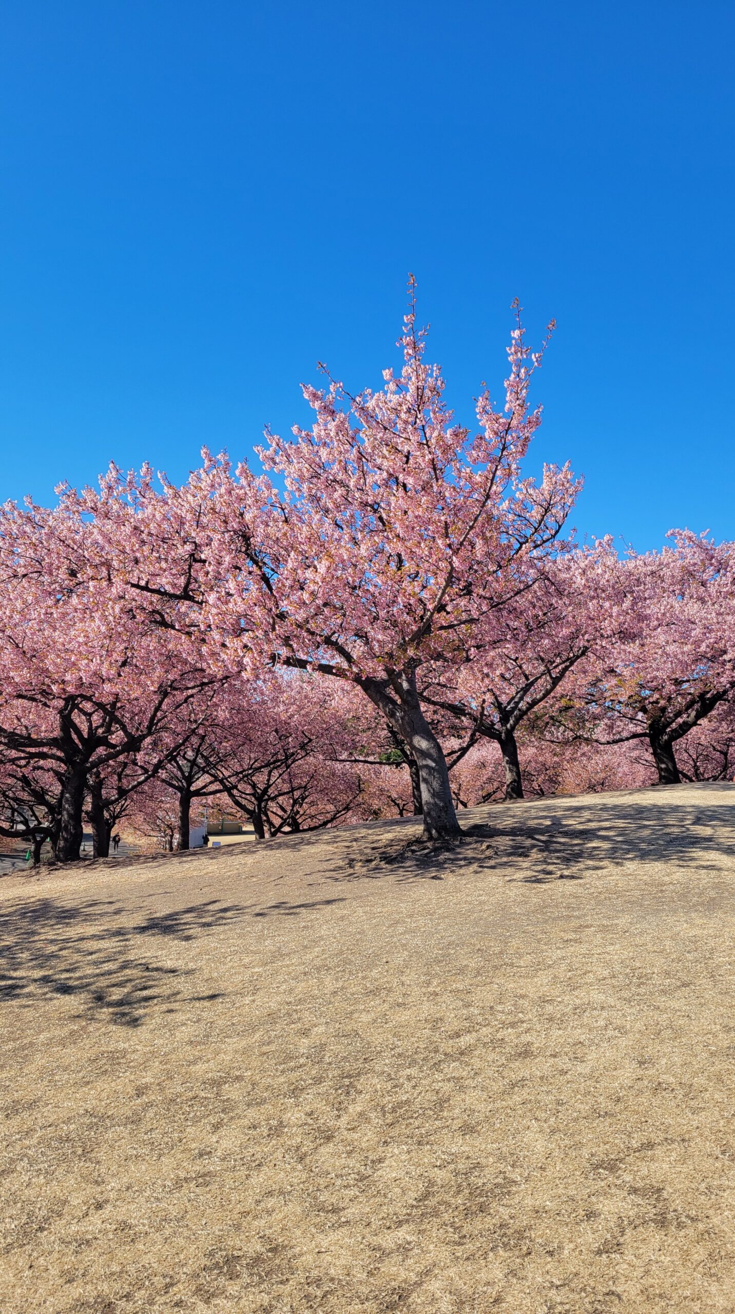 この写真は、伊勢崎市みらい公園で、小さな丘の上に咲く鮮やかなピンク色の河津桜がとても綺麗だったため、その美しさを素直に表現する形で撮影したものです。