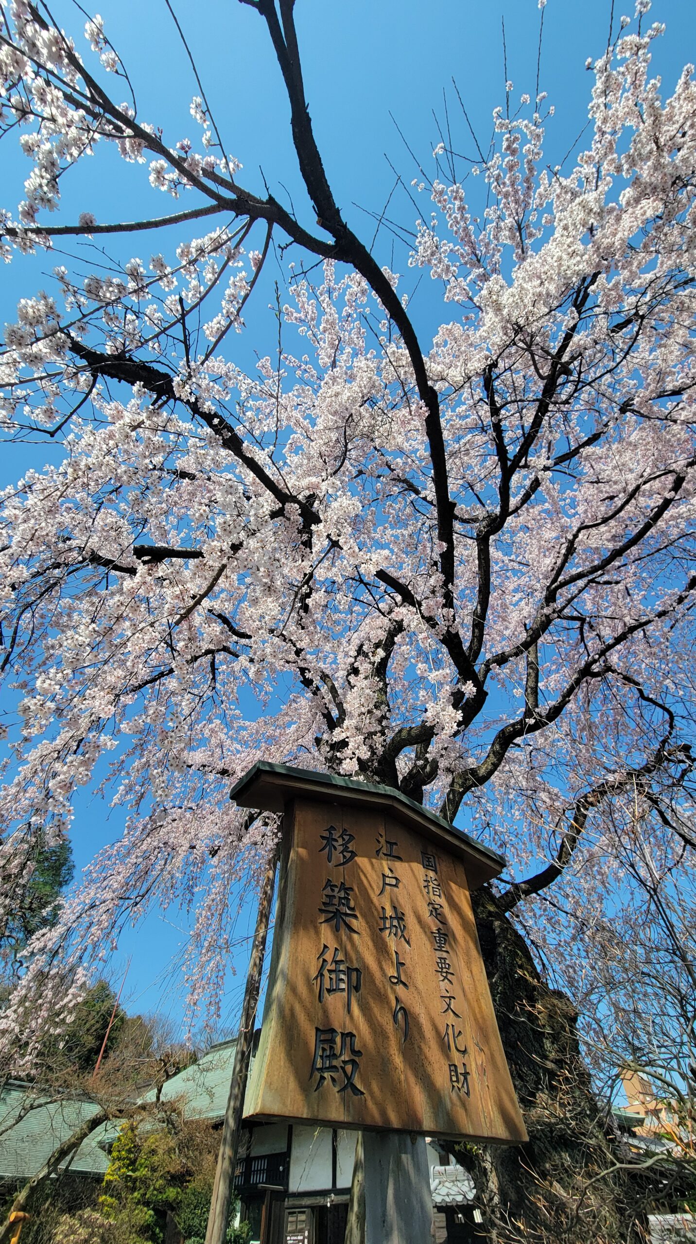This photo was taken at Kita-in Temple using a wide-angle lens and looking up from below to capture the signboard and weeping cherry blossoms together. The composition was created with a sense of scale in mind.