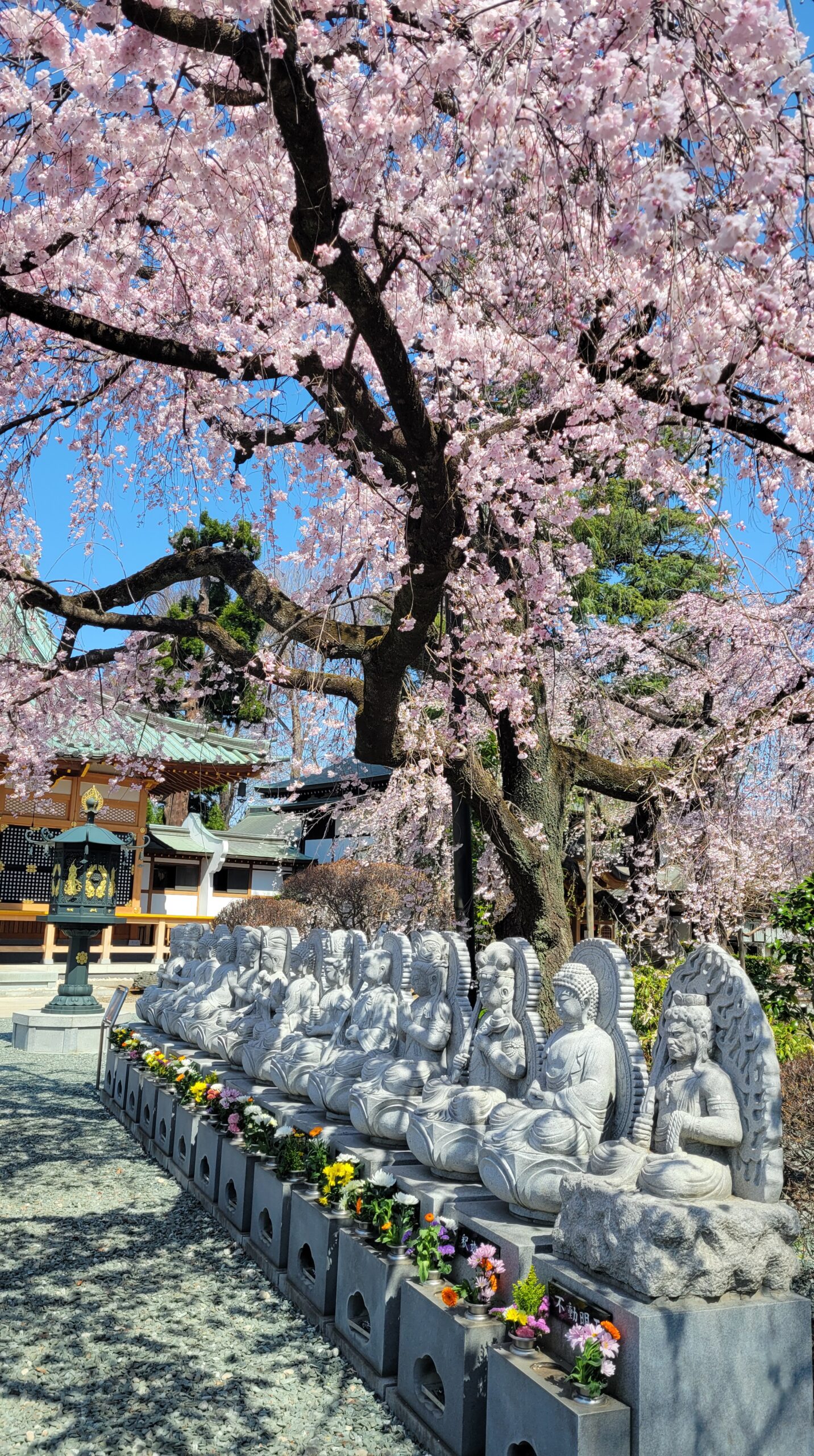 This photo was taken at Hodan-ji Temple and shows the combination of a Buddhist statue and weeping cherry blossoms above it. It is a scene where serenity and beauty coexist.