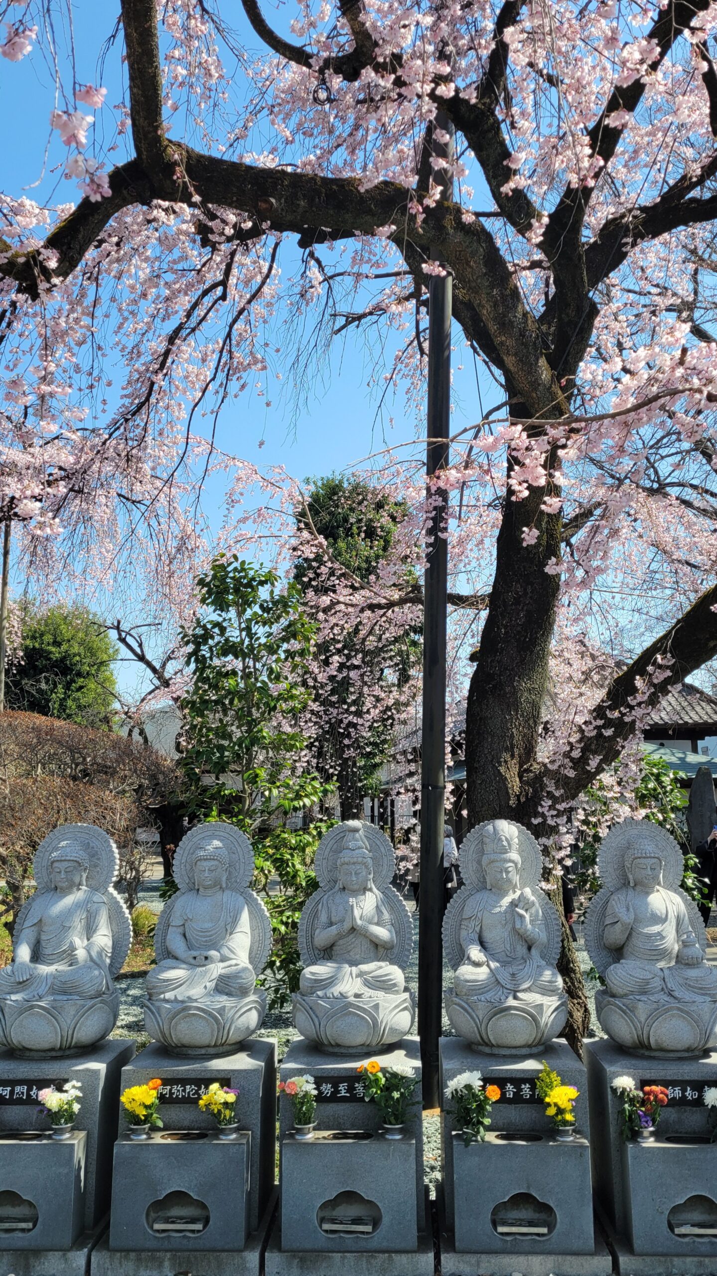 This photo was taken at Hodan-ji Temple, with the Buddha statue and weeping cherry tree in front of the temple in a well-composed shot.