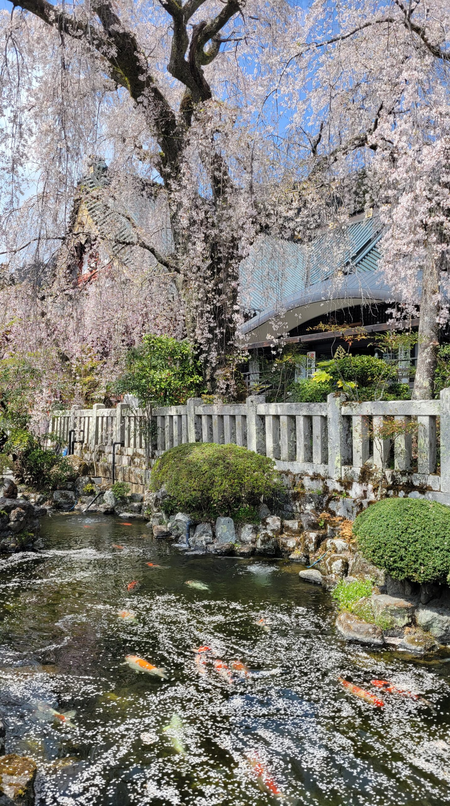 This photograph, taken at Kuonji Temple on Mt. Minobu, shows beautiful weeping cherry blossoms and a pond with many carp, creating a striking combination of stillness and movement.