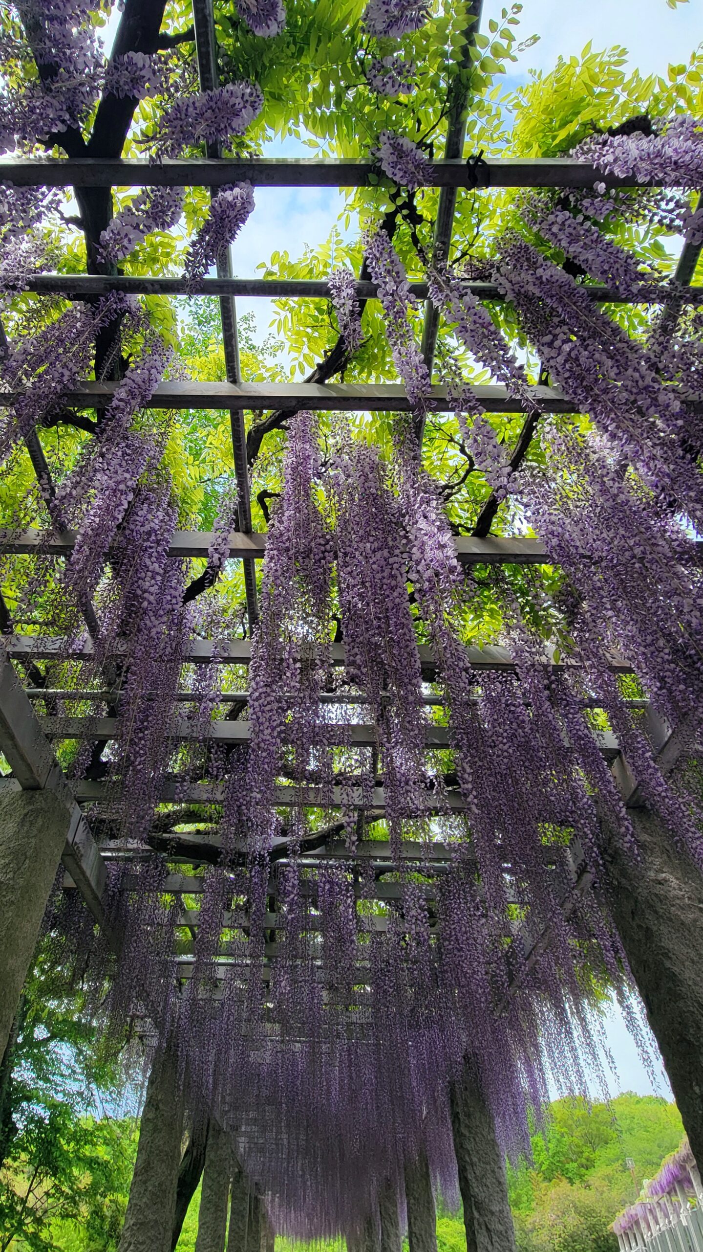 この写真は、ふじの咲く丘で、スマートフォンの広角モードを使い、下から見上げる形で藤の花を撮影したものです。見上げる構図によって藤の花が空へ広がるように見え、頭上から降り注ぐような迫力と開放感を表現しています。