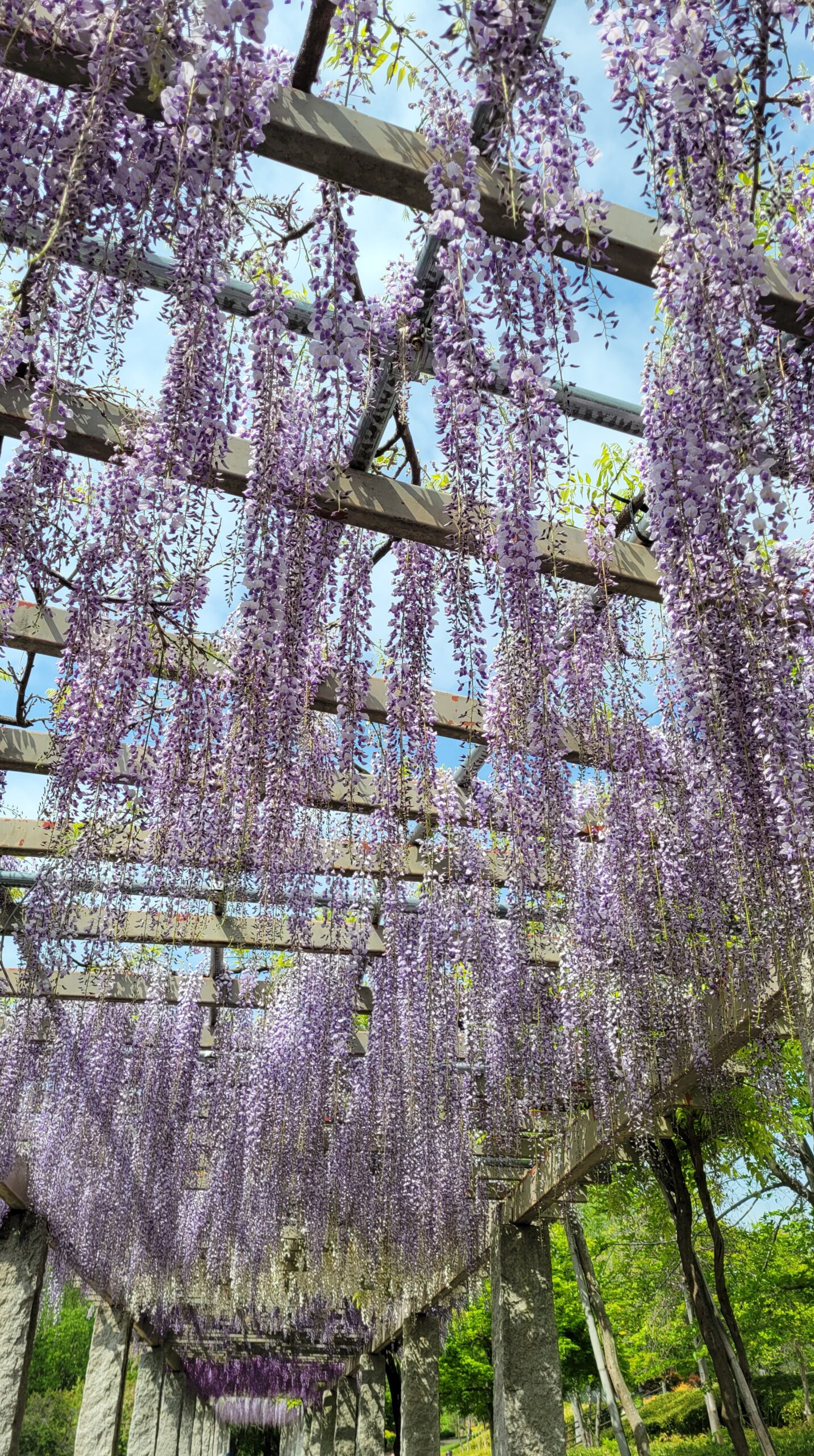 この写真は、ふじの咲く丘で、少し斜めの角度から奥行きを意識しながら、藤の花が流れるように咲く様子を撮影したものです。花房の連なりが自然なラインをつくり、藤棚の美しいリズムと春らしい優雅さを感じられる一枚です。