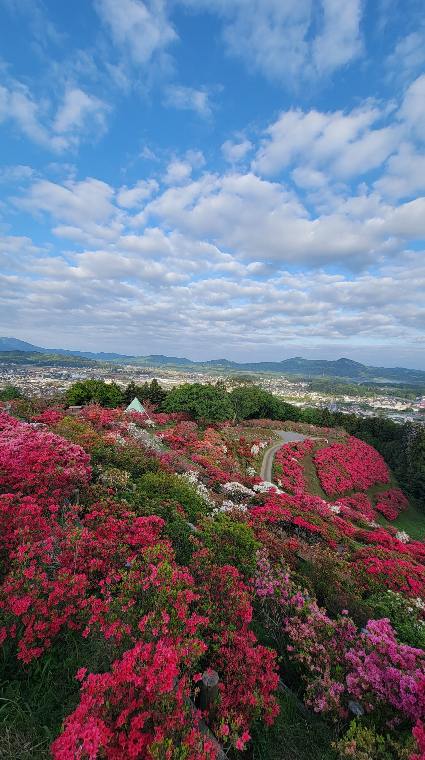 この写真は、笠間つつじ公園で、広角モードを使い、青空と丘の上に咲くツツジを撮影したものです。広々とした空と色鮮やかなツツジの丘が一体となり、笠間つつじ公園の開放感と春の見応えをしっかりと伝えています。