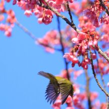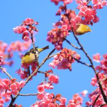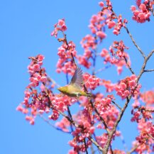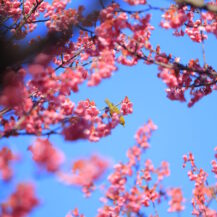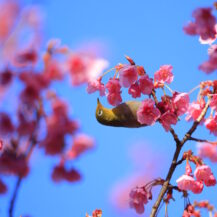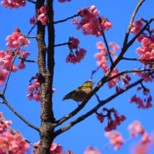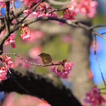 この写真は、荏原神社で、寒緋桜の枝にちょこんと座るメジロの姿を撮影したものです。