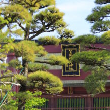This photo was taken at Kasama Inari Shrine, showing the pine trees and the shrine's torii gate.