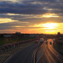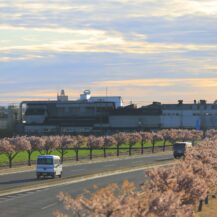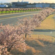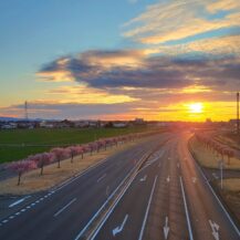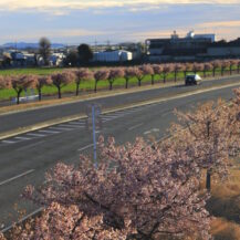 この写真は、玉村町の河津桜並木で、朝焼けの時間帯に、桜並木と国道沿いの道路を走る車の様子を一緒に捉え、早朝ならではの静かな雰囲気と桜並木の広がりを意識して撮影したものです。