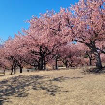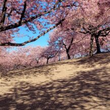 この写真は、榛の森公園で、小さな丘の上から河津桜と青空、さらに地面に映る河津桜の影まで含めて、春らしい景色を意識して撮影したものです。