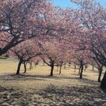 この写真は、伊勢崎市みらい公園で、小さな丘の上から下に向かって視線を落としながら、河津桜の林を見下ろす構図で、公園全体に広がる桜の景色を意識して撮影したものです。