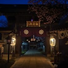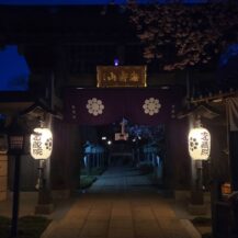 この写真は、密蔵院で、門に少し近づいた位置から、安行桜と門、提灯の灯りを組み合わせ、シンメトリーや水平ラインを意識した構図で撮影したものです。