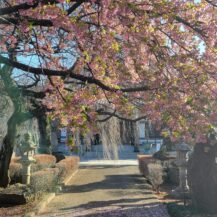 この写真は、浄源寺(岩槻)で、葉桜になり始めた河津桜とお寺の建物を組み合わせて、季節の移り変わりを感じる風景として撮影したものです。
