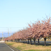 この写真は、玉村町の河津桜並木で、国道の側道から葉桜になりかけた河津桜並木と青空の様子を組み合わせ、広がりのある景色として撮影したものです。
