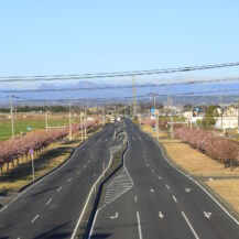 2026 玉村町の河津桜並木|歩道橋から見る桜並木の道路